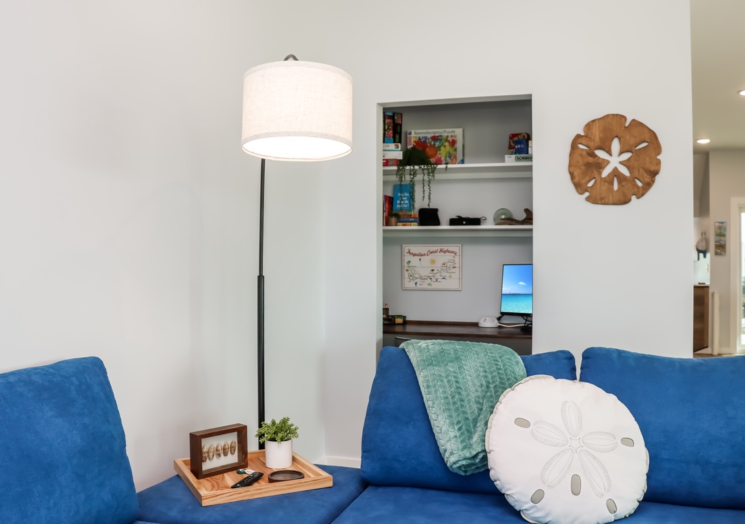 Take the party outside to one of the multiple decks, including an extended beachfront deck with a covered and open section, outdoor dining table, sitting area, and ceiling fans. For those who love to grill, the small roadside deck off the kitchen is equipped with a gas grill, making outdoor cooking a breeze. Need to catch up on work during your vacation? The living room also features a custom-built desk cubby, ensuring you can work in style and comfort.