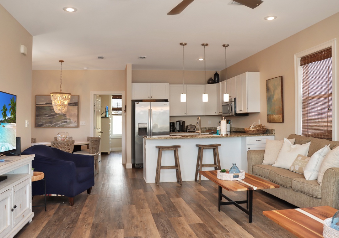 Searenity, a vacation favorite, has recently undergone improvements to ensure your family's comfort and enjoyment. The addition of a bunk room on the ground floor, complete with two sets of bunk beds and a TV, provides a cozy and fun space for the kids. The private pool, a highlight for everyone, offers an alternative to the gorgeous beach just a short walk away. After a day of fun, rinse off in the enclosed outdoor shower before coming inside for the night.