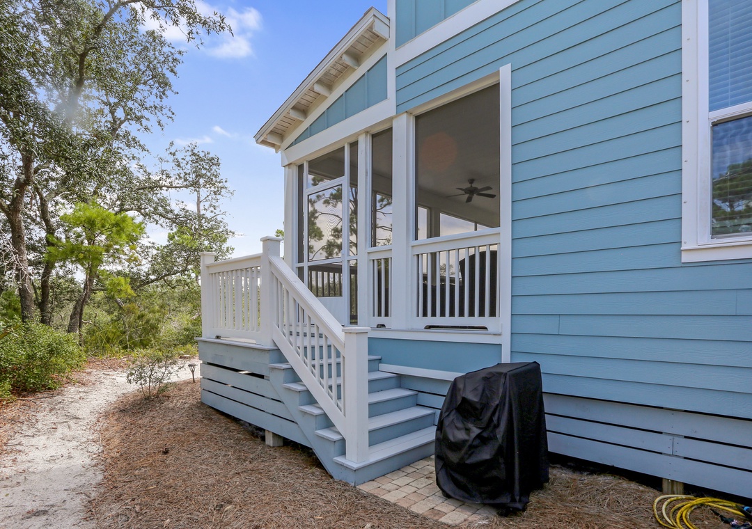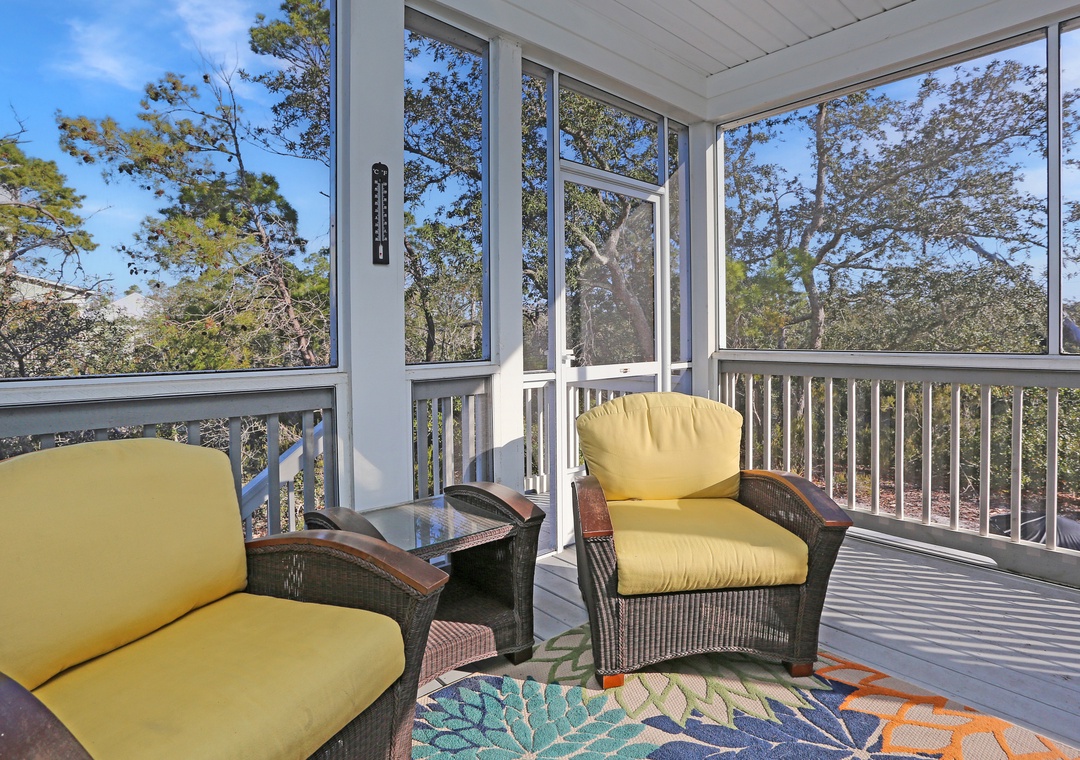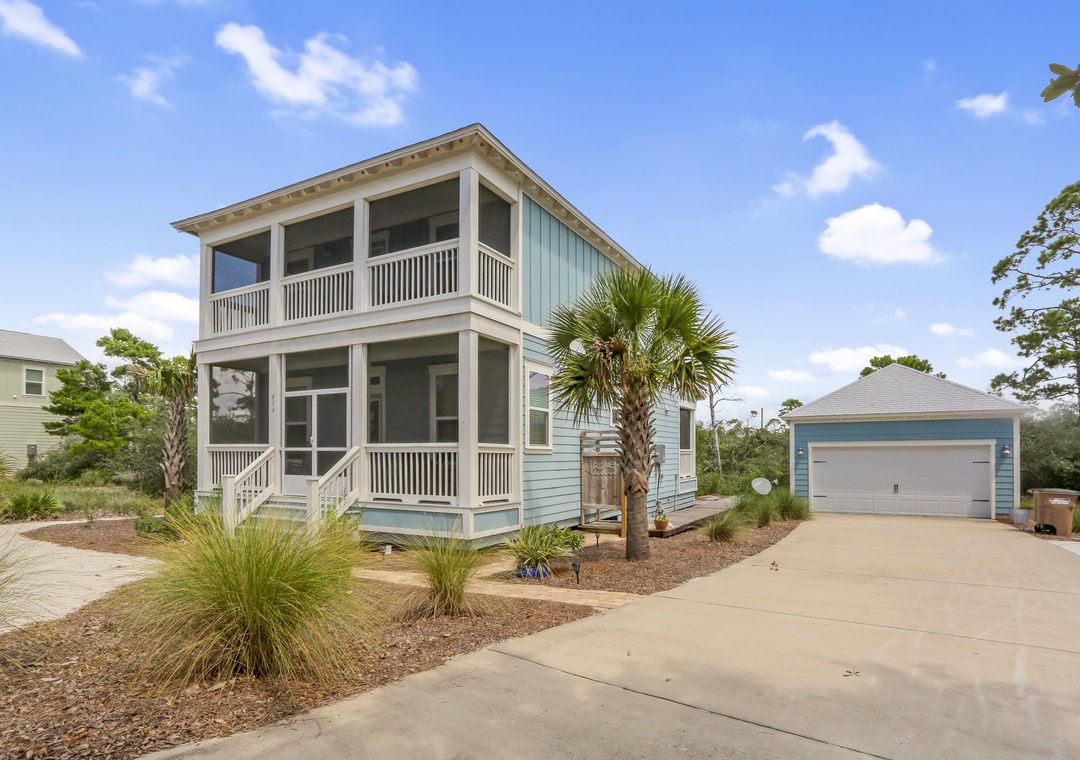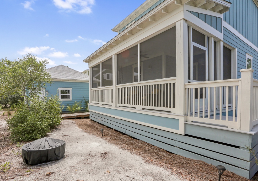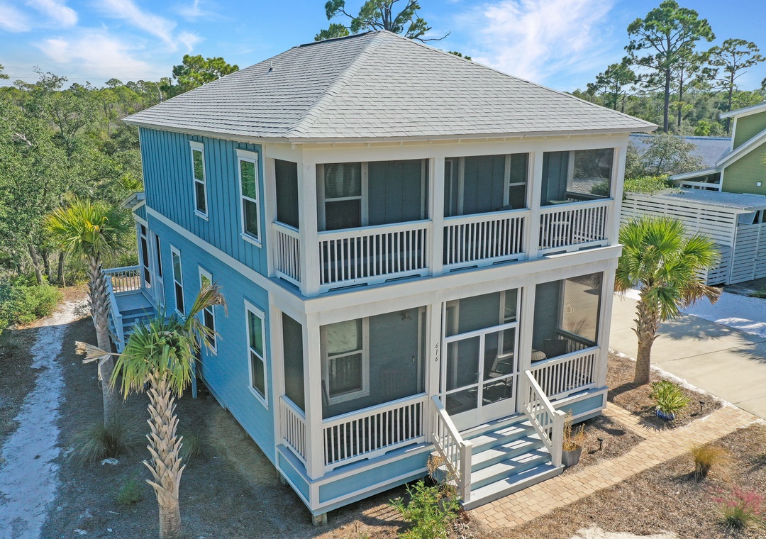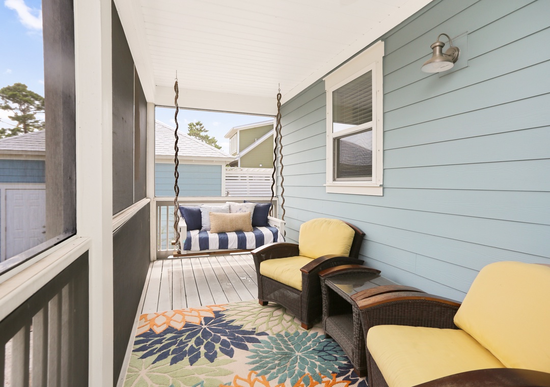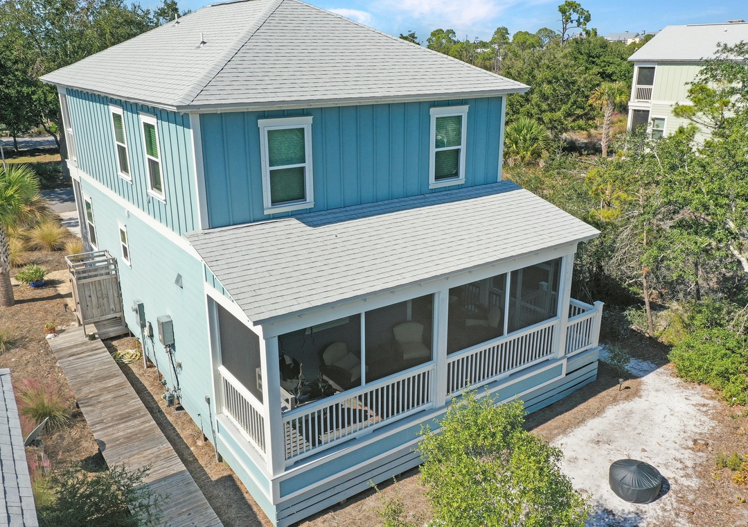 Song of the Sea is a beautiful 3-bedroom single-family beach home located in a more quiet spot in the neighborhood. It’s a spacious family home designed to sleep a group of 10 comfortably. The ground floor is an open layout with a large TV and seating area in the living room that flows well into the kitchen and dining area. Beyond the dining area on the rear exterior is a lovely screened porch, including outdoor seating and a swing. You will find a grilling area and a backyard fire pit outside this porch. The bedrooms are on the second floor, with the master bedroom providing a quiet space on the small screened deck.