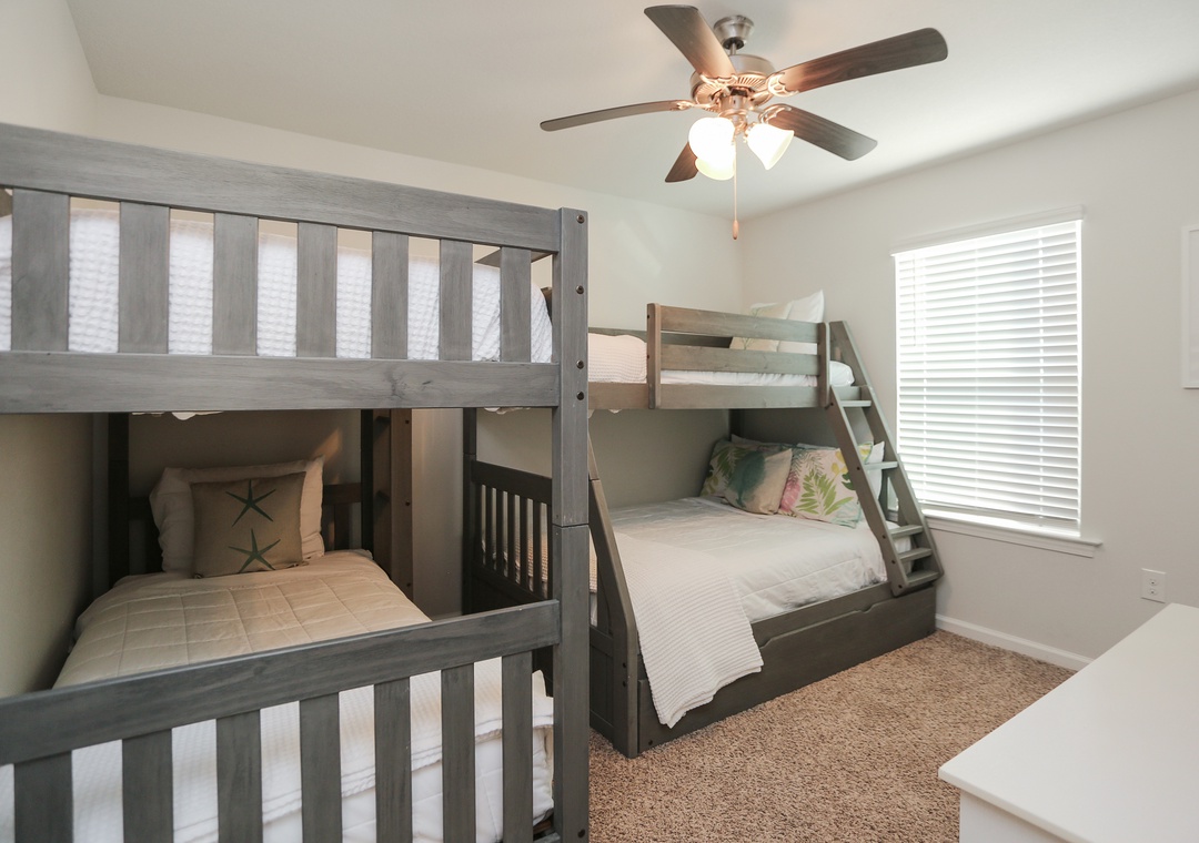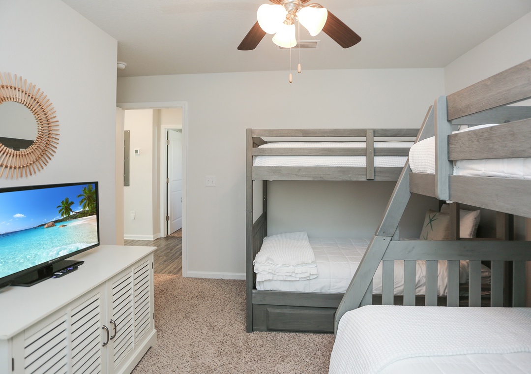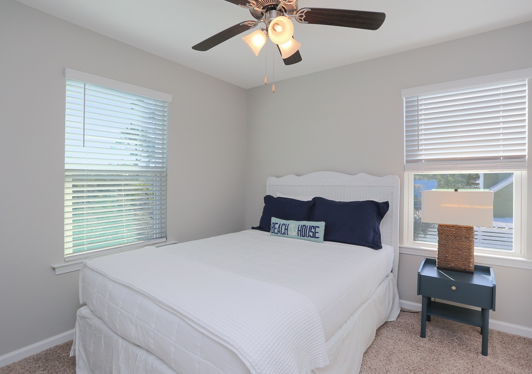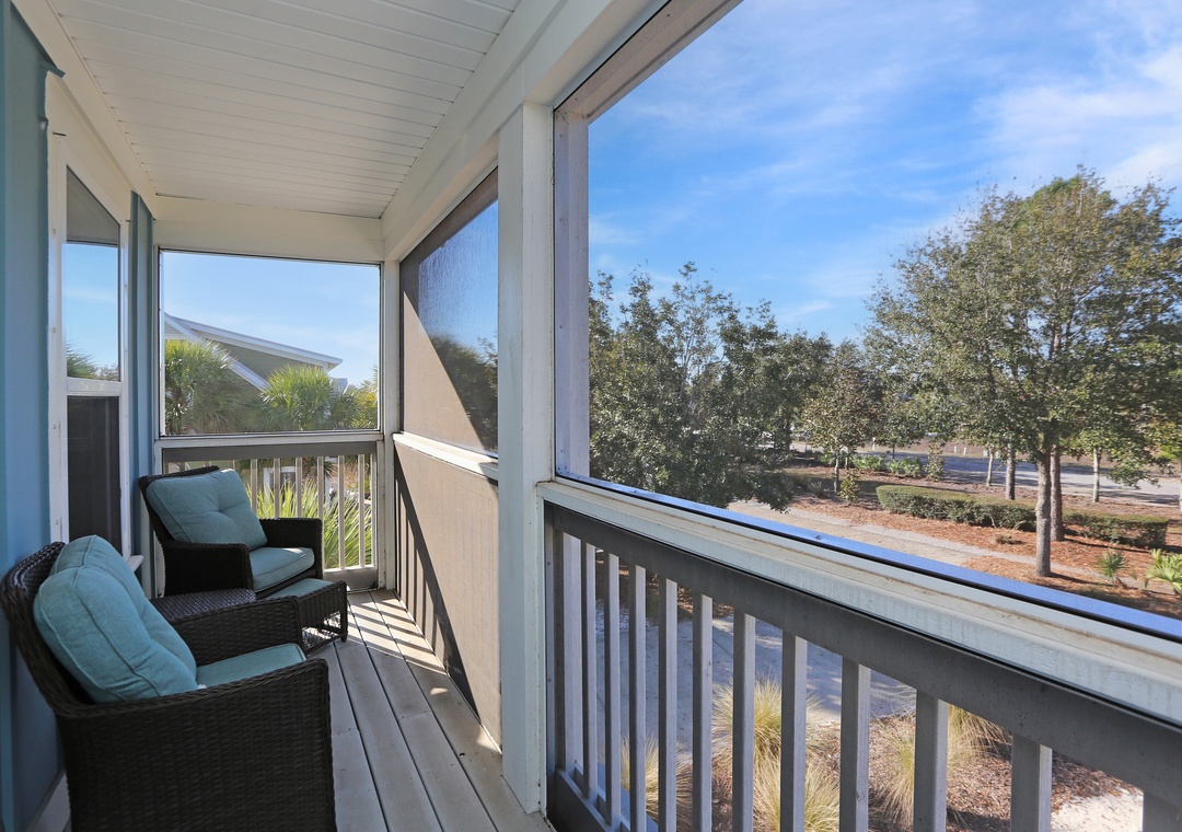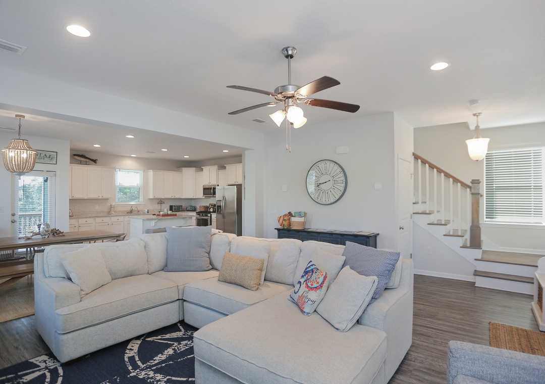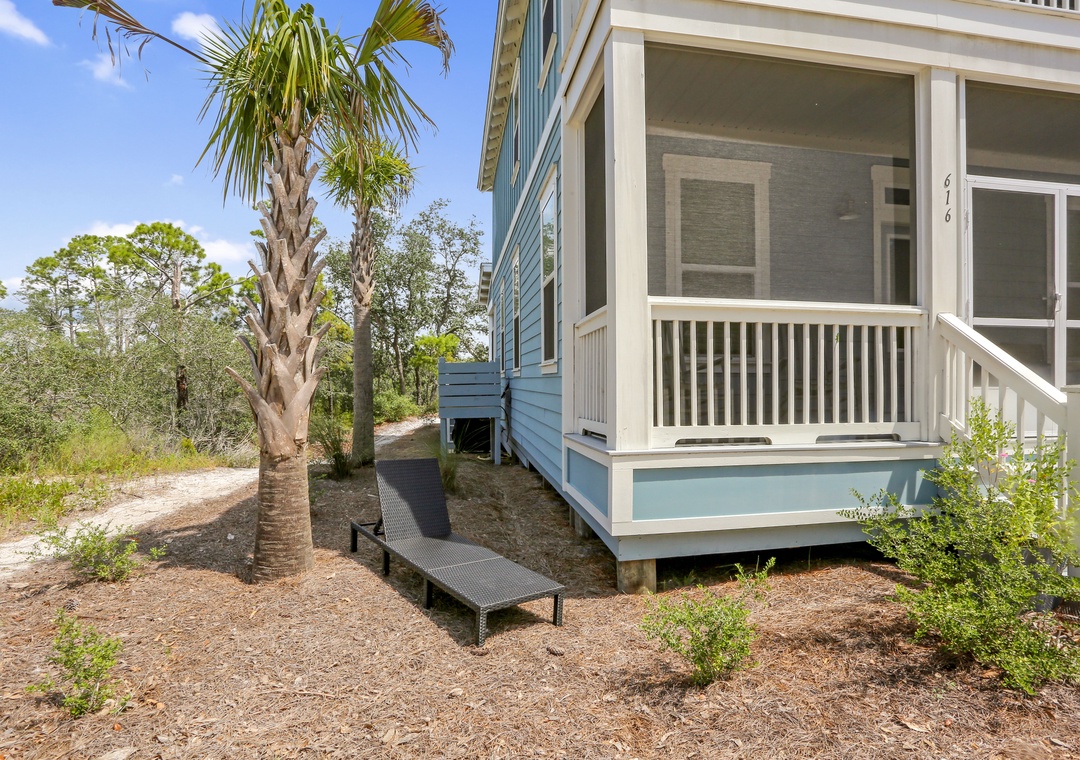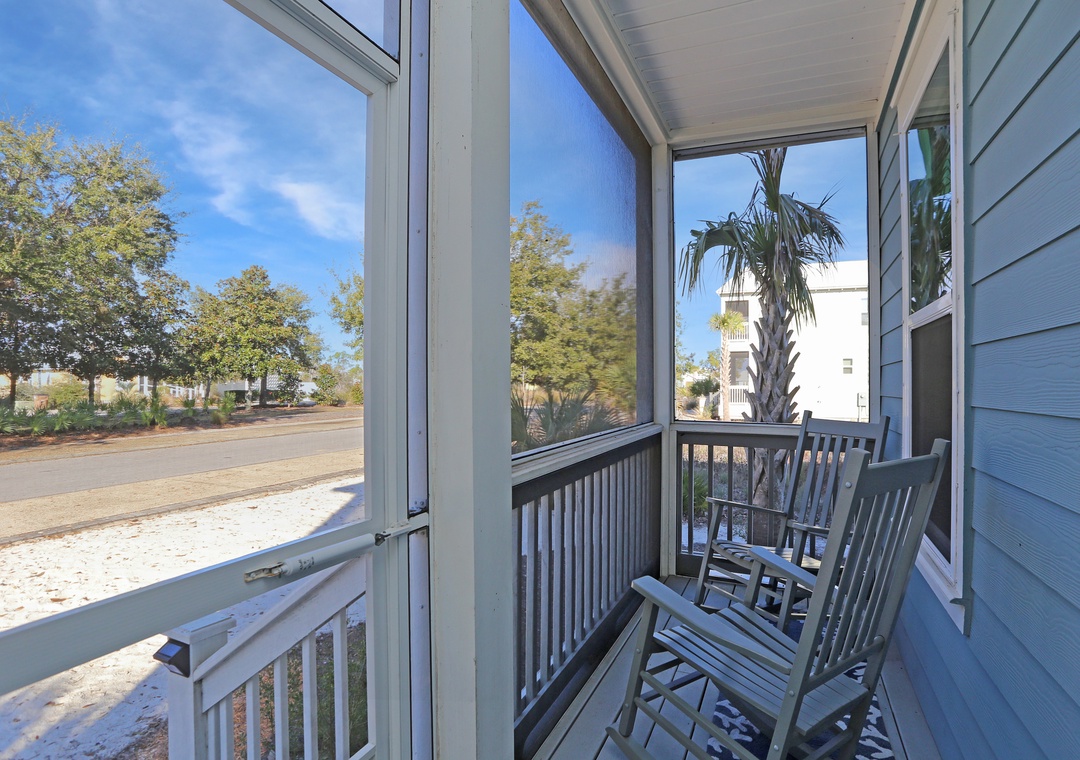 Song of the Sea is a beautiful 3-bedroom single-family beach home located in a more quiet spot in the neighborhood. It’s a spacious family home designed to sleep a group of 10 comfortably. The ground floor is an open layout with a large TV and seating area in the living room that flows well into the kitchen and dining area. Beyond the dining area on the rear exterior is a lovely screened porch, including outdoor seating and a swing. You will find a grilling area and a backyard fire pit outside this porch. The bedrooms are on the second floor, with the master bedroom providing a quiet space on the small screened deck.
