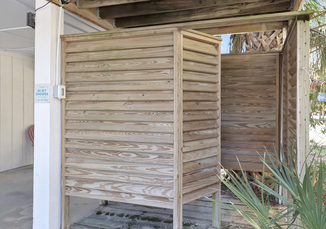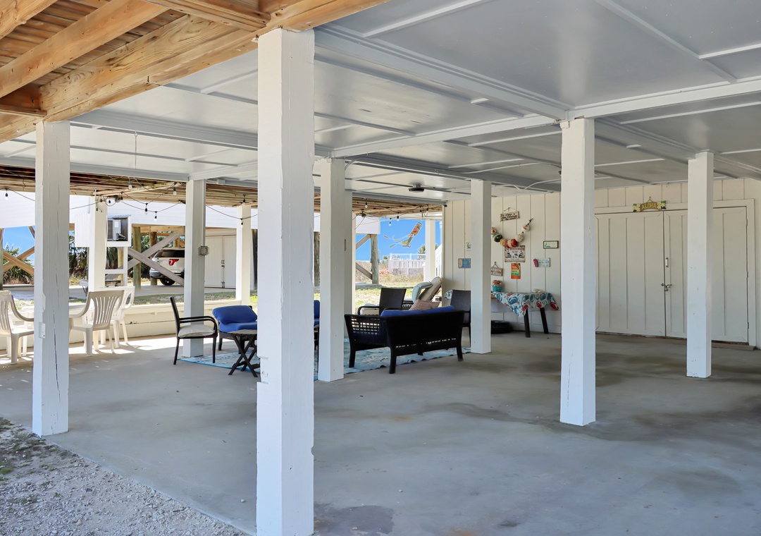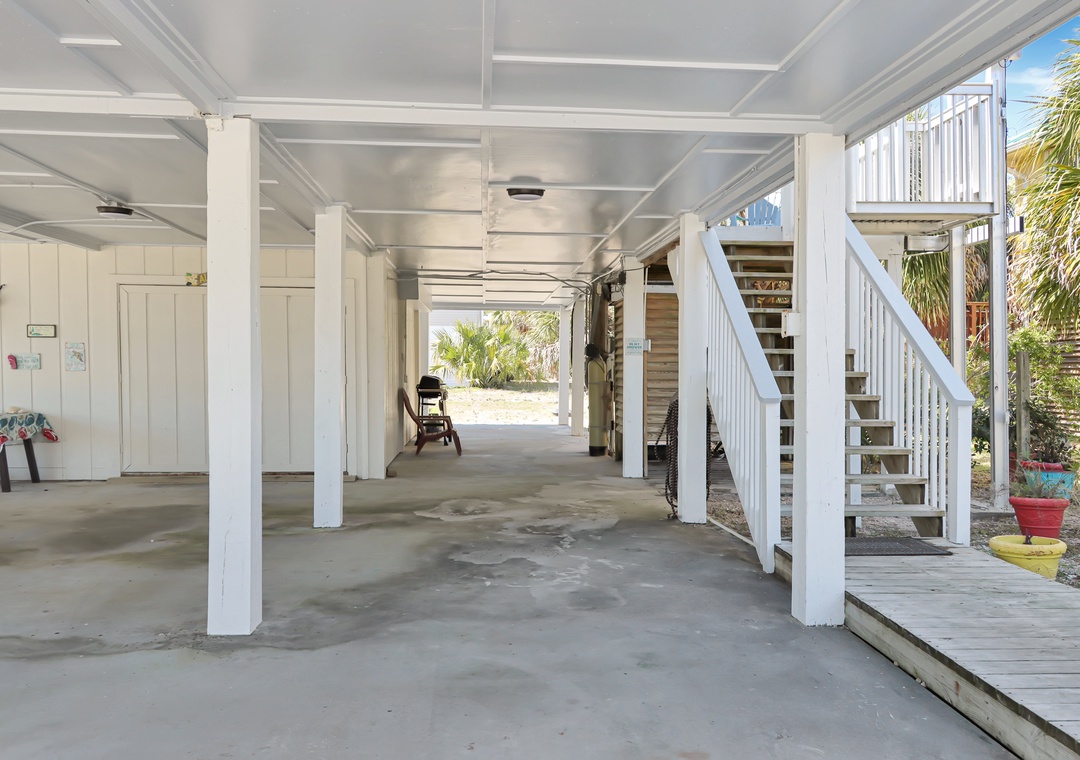 Floor Plan: Ground Level - carport, outdoor shower, outdoor sitting area with picnic table. First Floor - great room which has a living area with TV, dining area that seats 10, and fully equipped kitchen with bar seating; Screen Porch - has plenty of outdoor seating and gulf views and is accessible by the living area, kitchen, and bunk room; Bedroom 1 - king with Smart TV, full bath, and walk-in shower; Bedroom 2 - queen with Smart TV; Share Full Bath with large walk-in shower; Bedroom 3 - queen with Smart TV and great gulf views; Jack-n-Jill Full Bath with large tiled tub/shower and separate entrance; Bunk Room - four twin beds with DVD/TV and a large selection of movies.