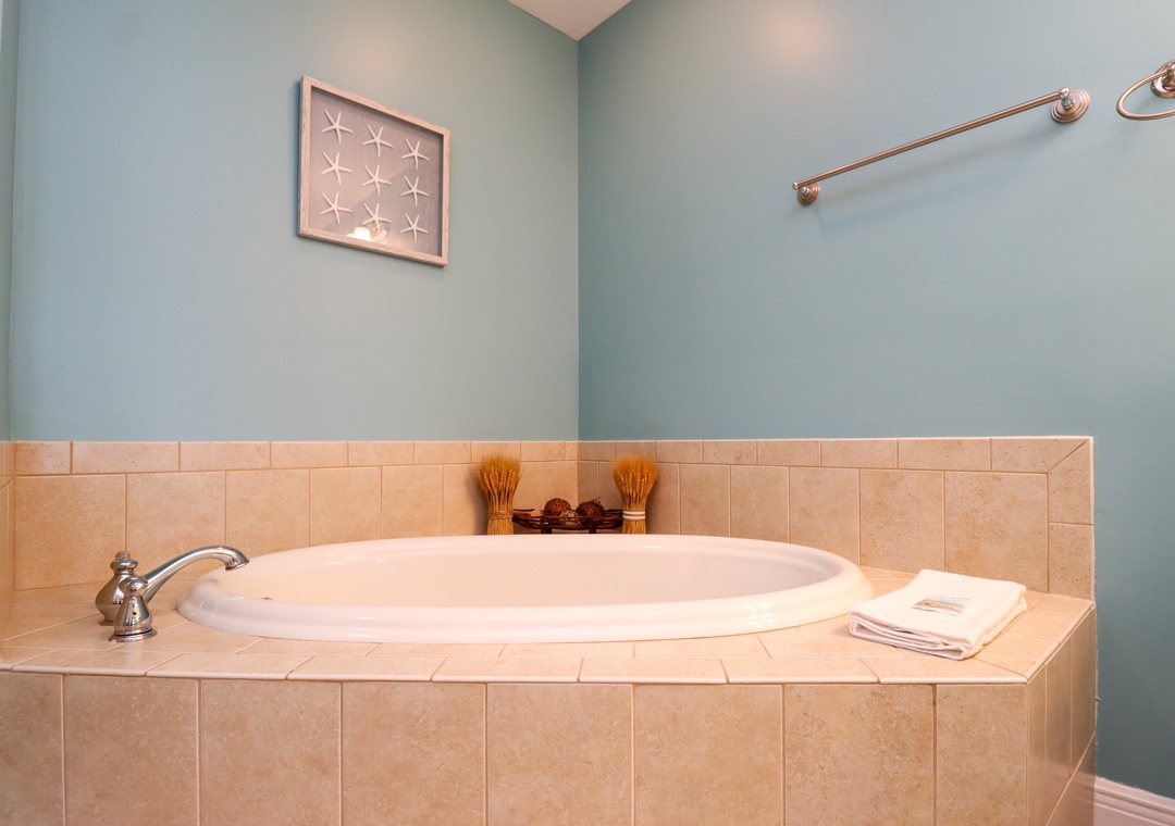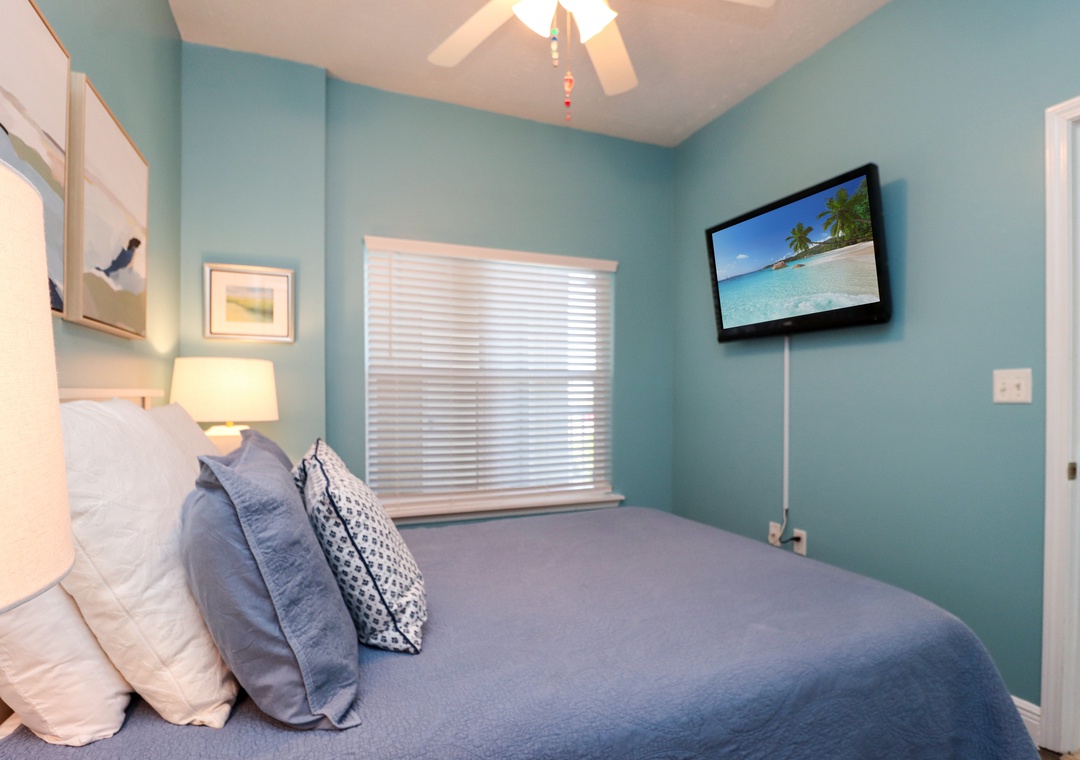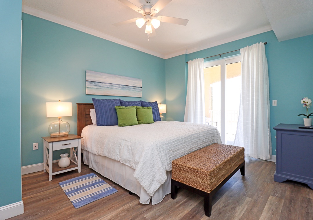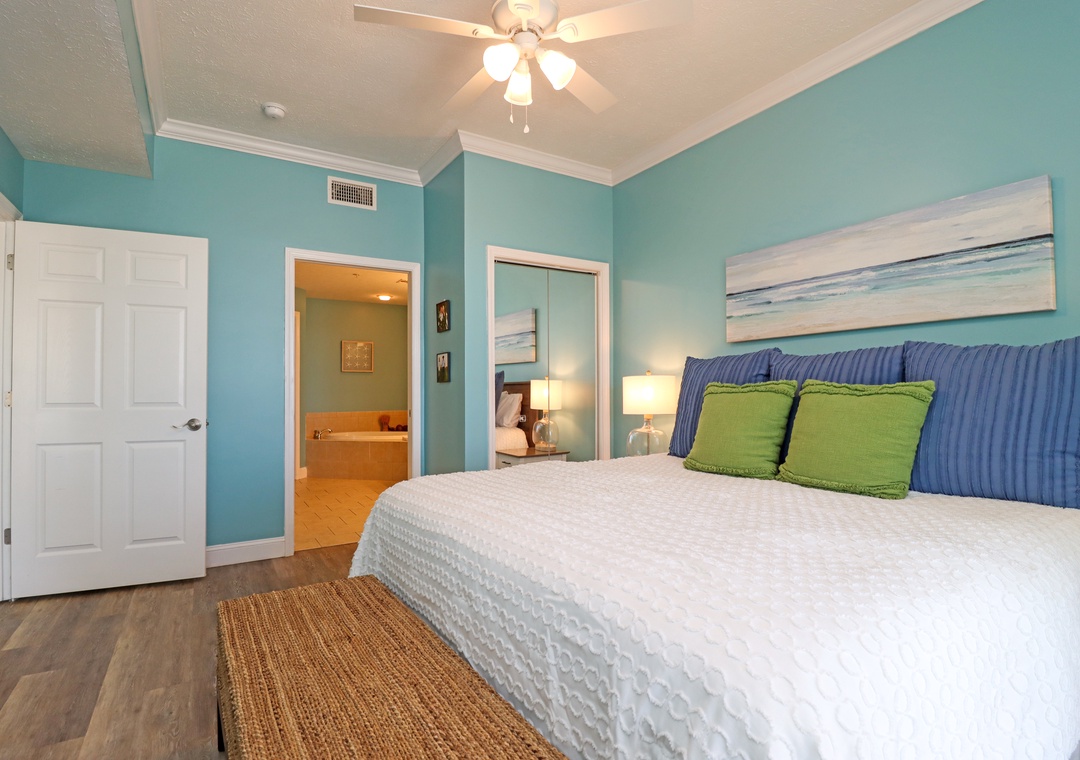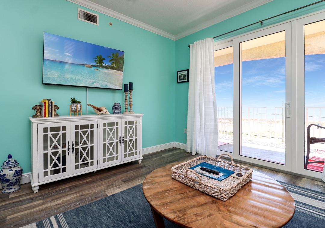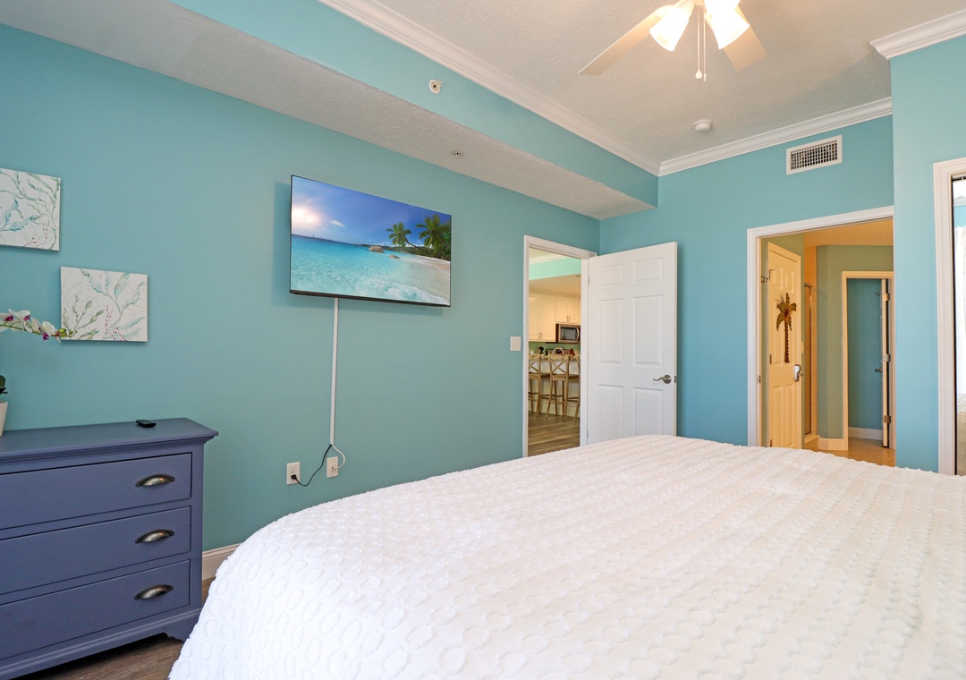 Harvesting Sunshine is a three bedroom condo housing a party of 8 ,one master with a king bed and two guest rooms with queens. The master bedroom is on the beachside of the condo and includes sliding glass doors with entry onto the deck and magnificent gulf views. It also is equipped with a large master bath that has a separate shower and soaking tub. Each bedroom, including the two guest rooms, is stocked with a TV. The living room has a sleeper sofa for two extra.