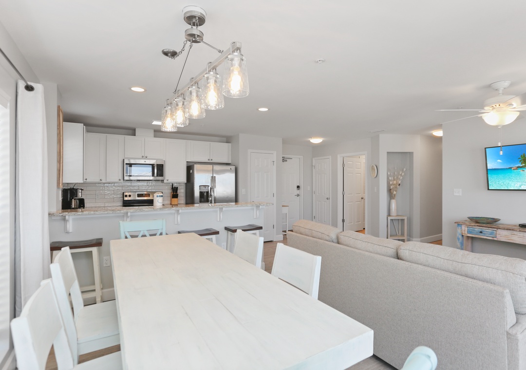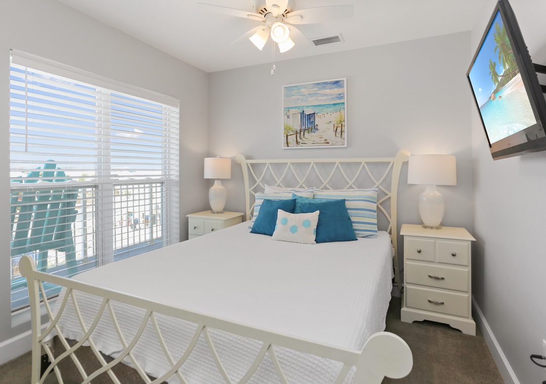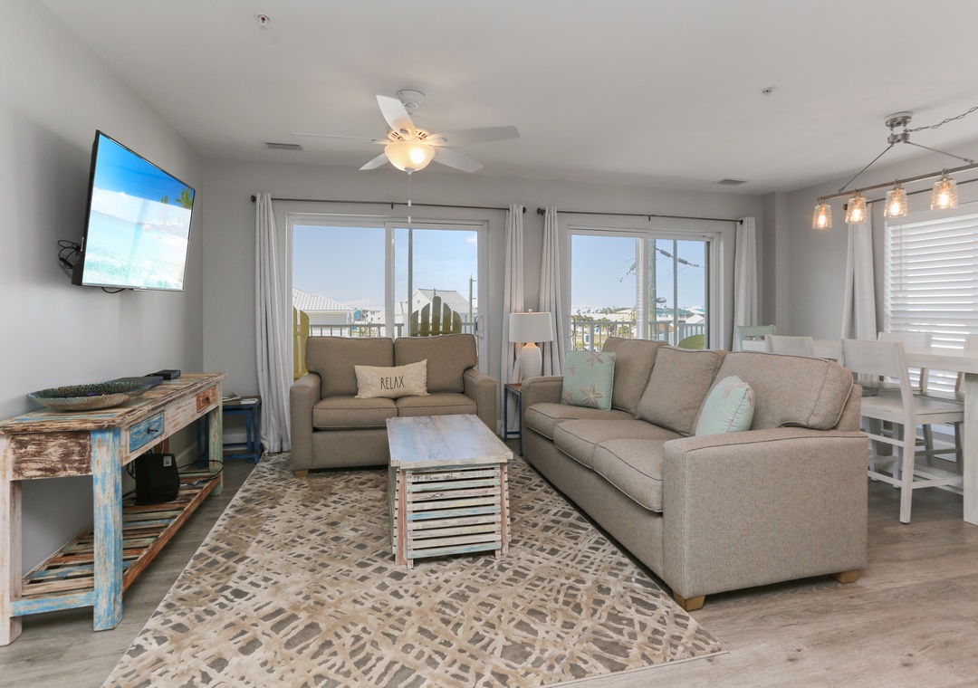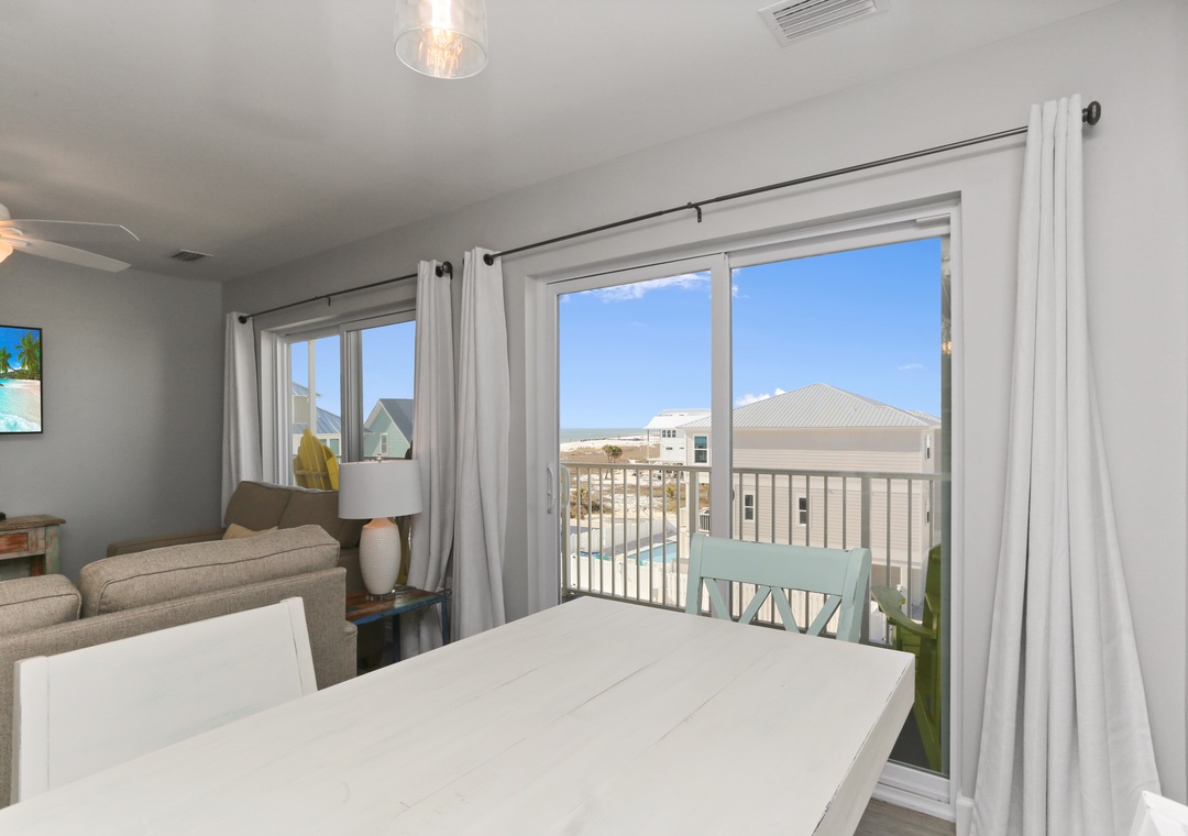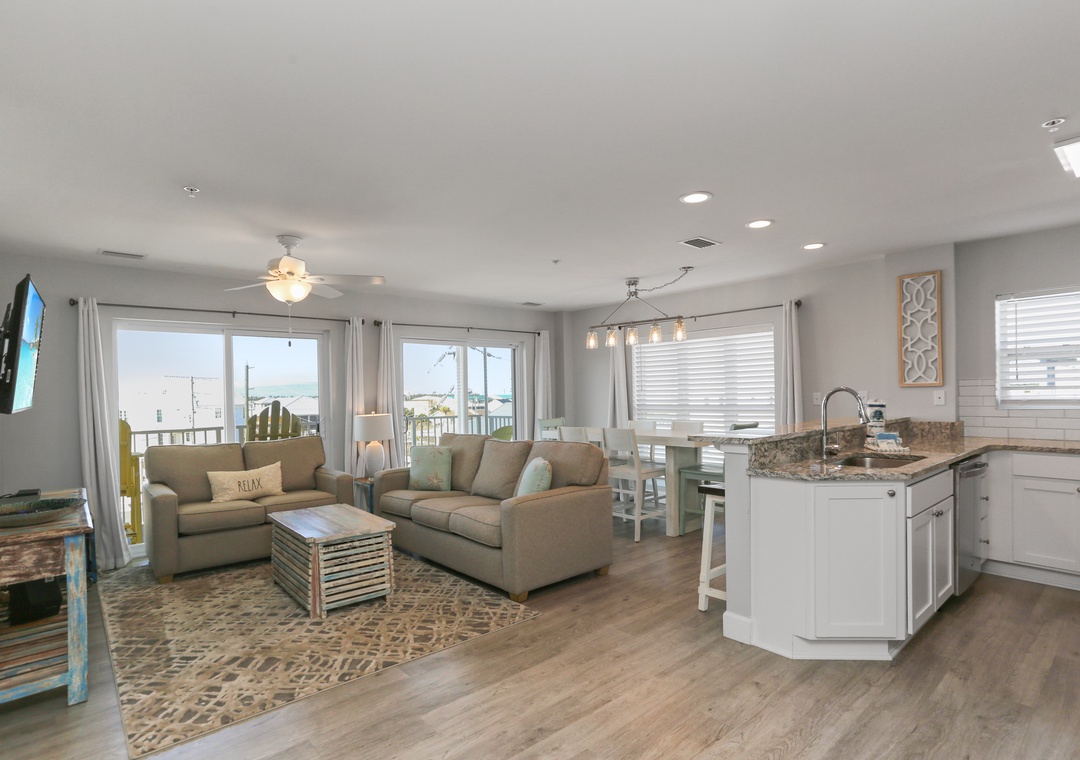 Inside this spacious condo, a group of six have plenty of room to spread out with a queen bed in the guest room and a king in the master. The master comes complete with a master bath large enough to escape reality. Views from every room inside are also quite unbelievable. The living area is laid out in an open format allowing conversations to take place between the kitchen, living room and dining area. The living room has floor to ceiling windows all along two sides of the room and includes a large TV to watch. It’s questionable if you’ll be able to take your eyes off the beach views to enjoy though.