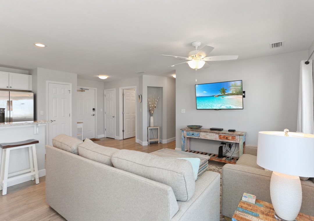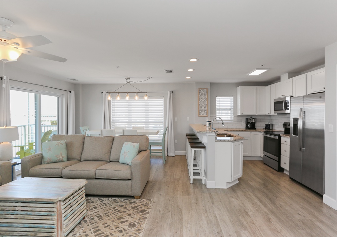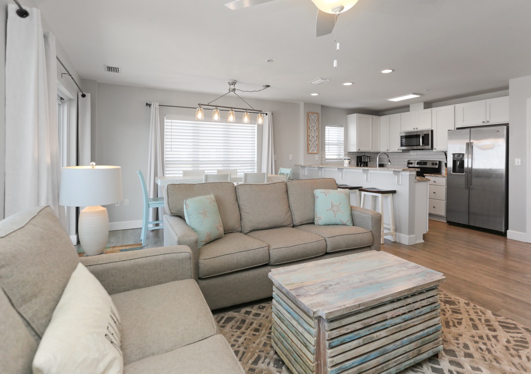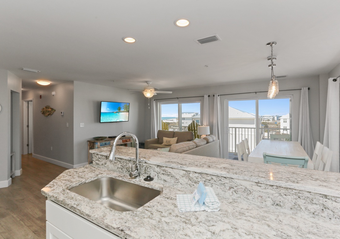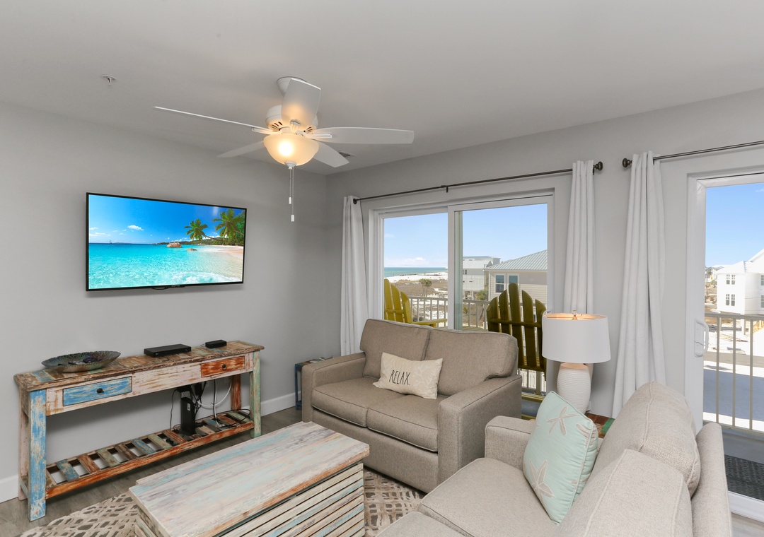 Inside this spacious condo, a group of six have plenty of room to spread out with a queen bed in the guest room and a king in the master. The master comes complete with a master bath large enough to escape reality. Views from every room inside are also quite unbelievable. The living area is laid out in an open format allowing conversations to take place between the kitchen, living room and dining area. The living room has floor to ceiling windows all along two sides of the room and includes a large TV to watch. It’s questionable if you’ll be able to take your eyes off the beach views to enjoy though.