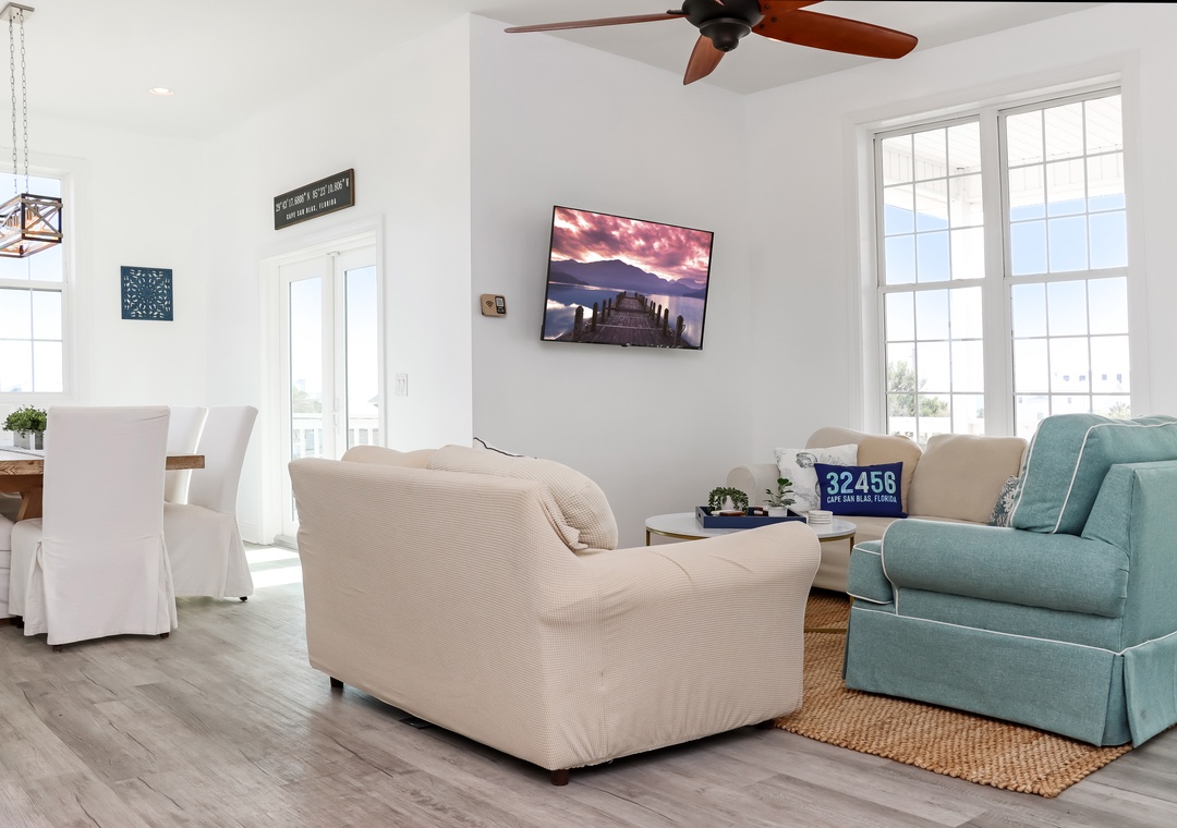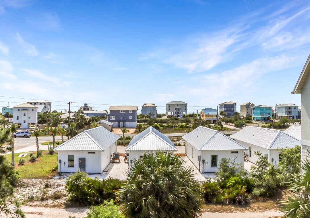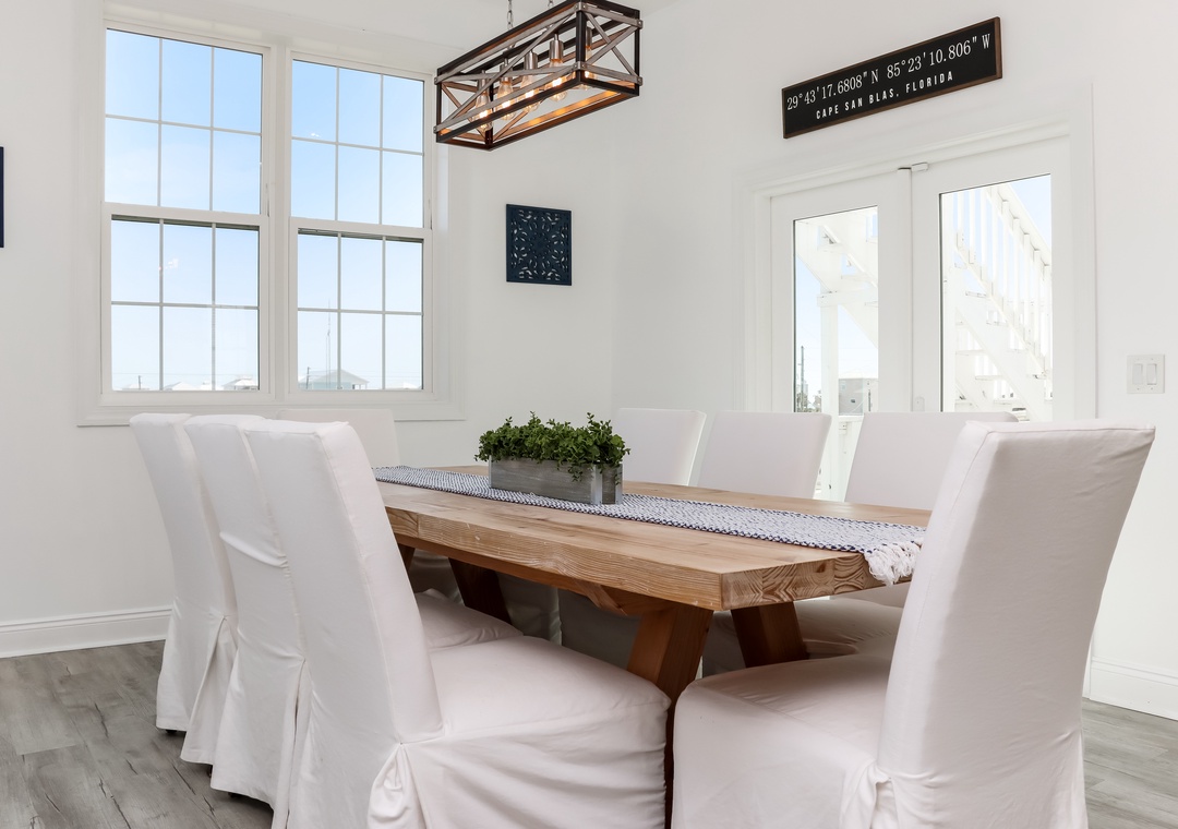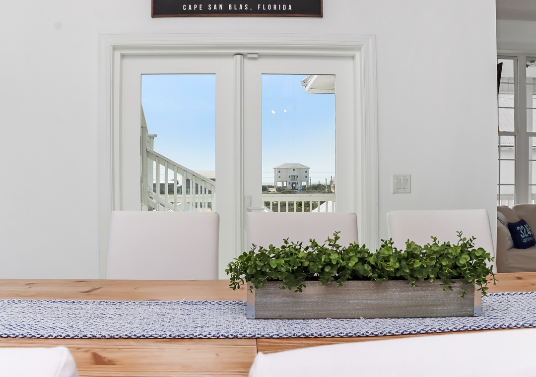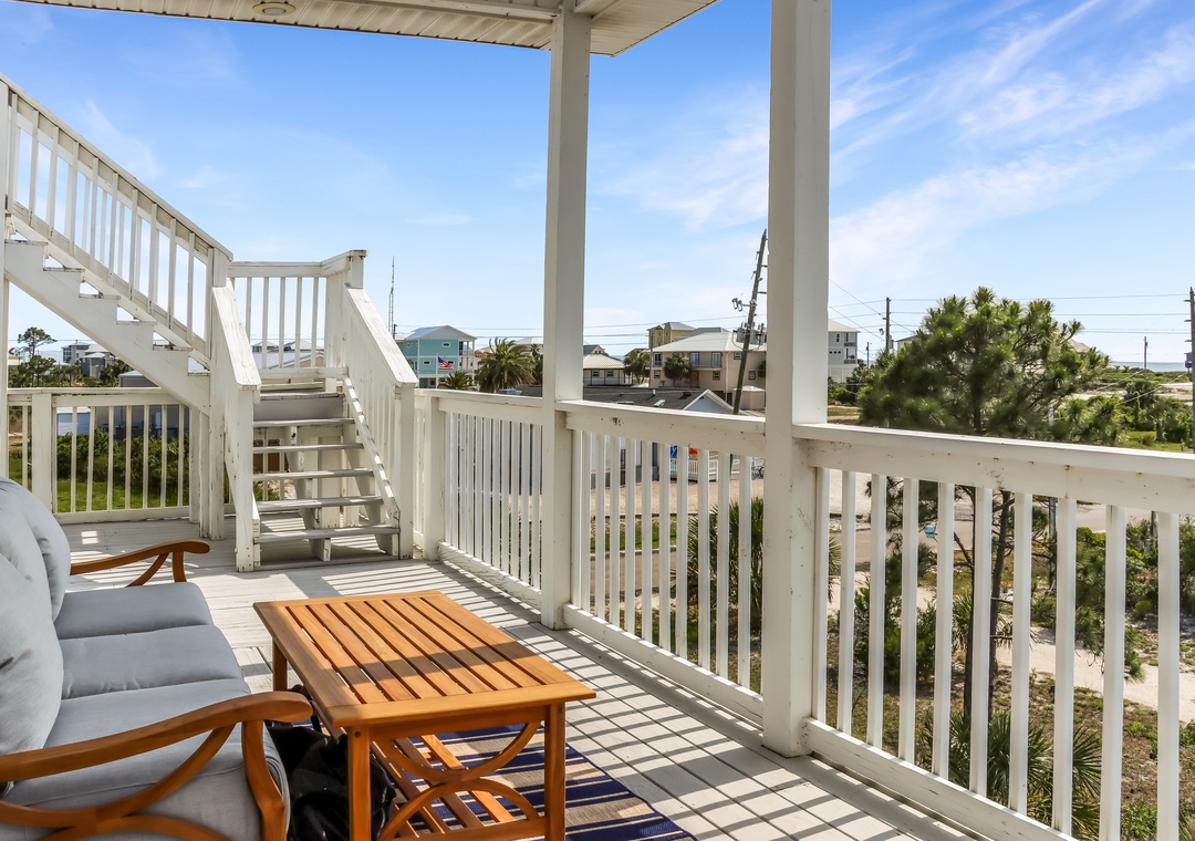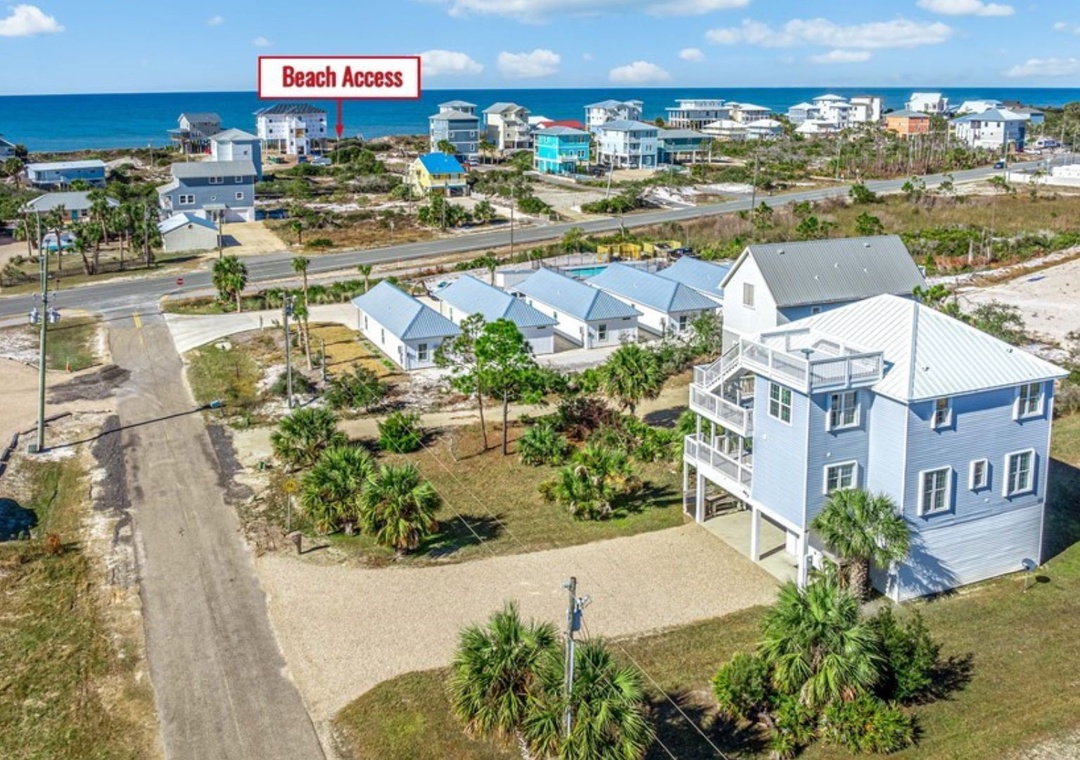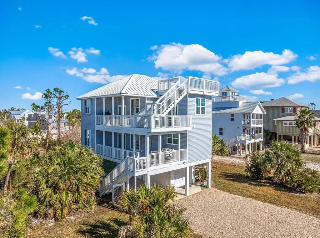 Welcome to The Blue Pelican, your perfect seaside escape on Cape San Blas's bayside. This stunning 5-bedroom, 3.5-bathroom beach home comfortably accommodates up to 12 guests and is also pet-friendly. Enjoy the outdoors in the spacious backyard and covered area under the house, which features an outdoor shower and a picnic table. The two levels of covered decks offer beautiful views of the Gulf and Bay, along with a rooftop deck for panoramic vistas. With luxurious outdoor furniture, including an oversized swing, you may find it hard to leave one of the two decks.