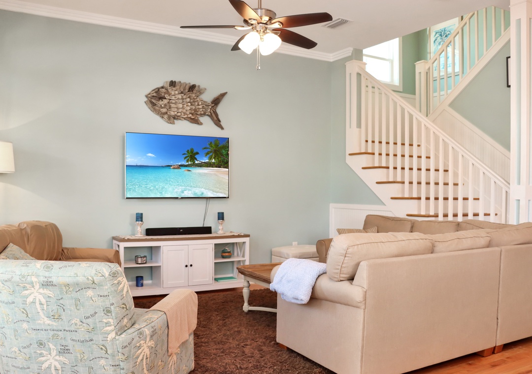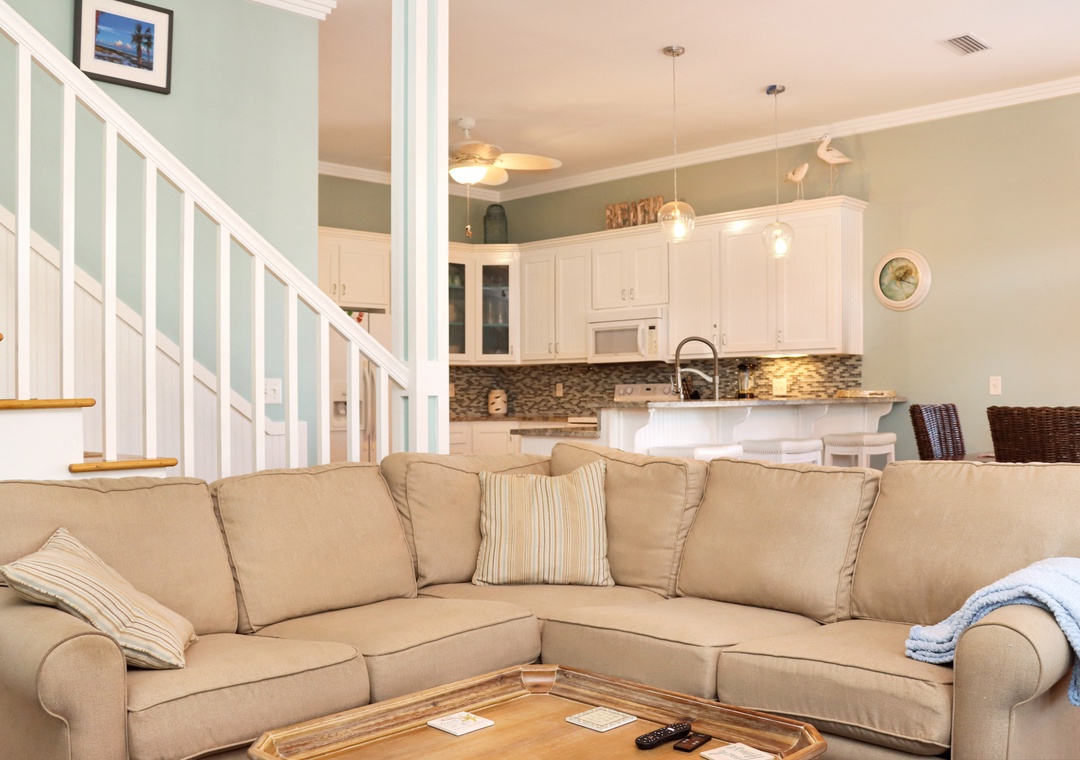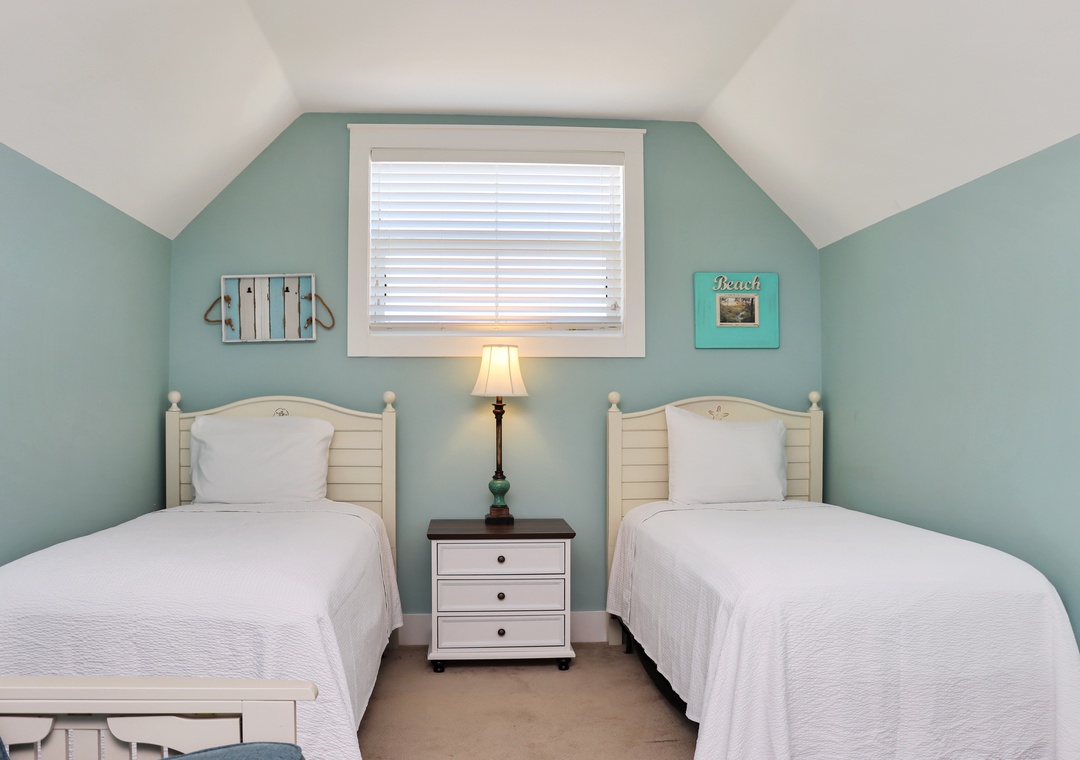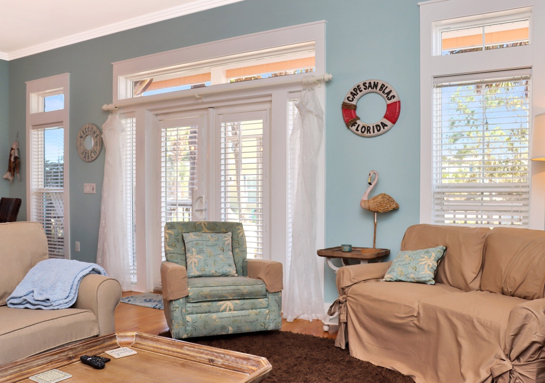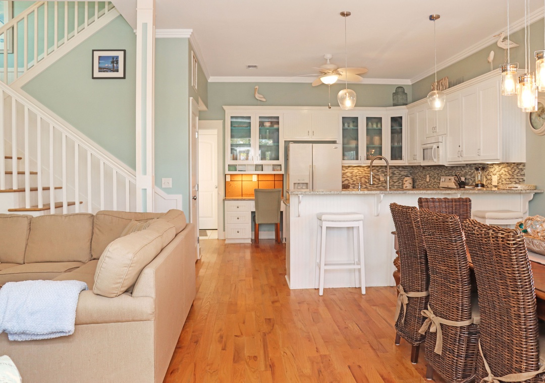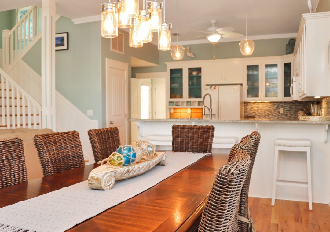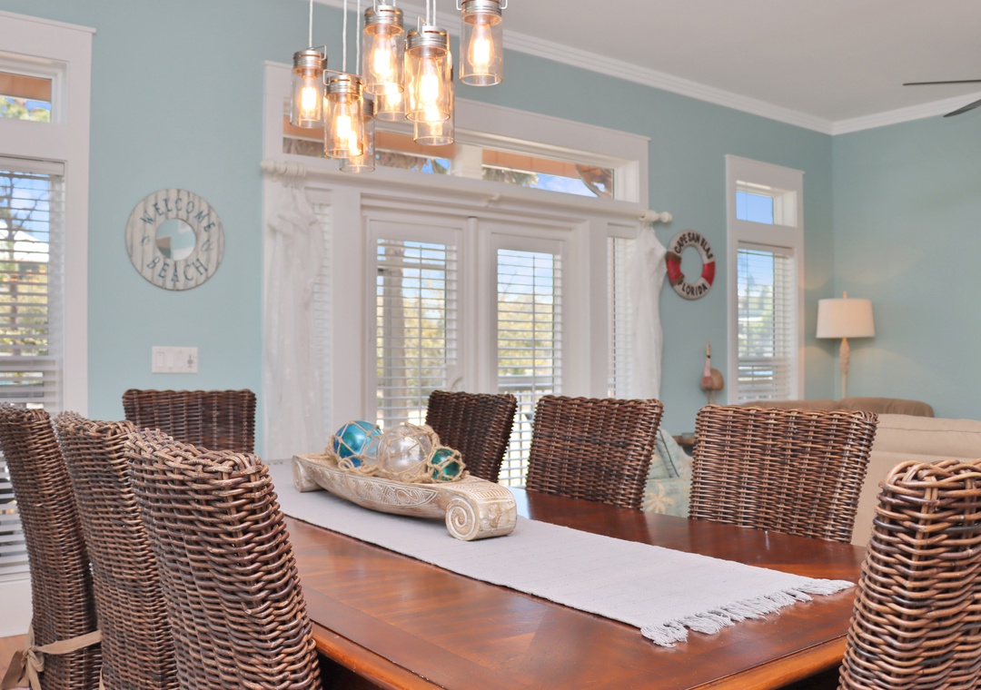 The Peaceful Pelican is a stunning beach vacation rental in the prestigious Jubilation Community on Cape San Blas. It can accommodate up to 10 guests. This 3-bedroom, 3-bathroom home features a top-floor family room, perfect for watching movies, playing foosball, or sleeping four guests on two twin beds and a double futon. The main living area is on the ground floor, including a living room, dining area, and a spacious kitchen with a small workspace and a full bathroom. On the second floor, you'll find two guest bedrooms, each with queen beds, along with a luxurious master suite that boasts a king bed and a private master bathroom.