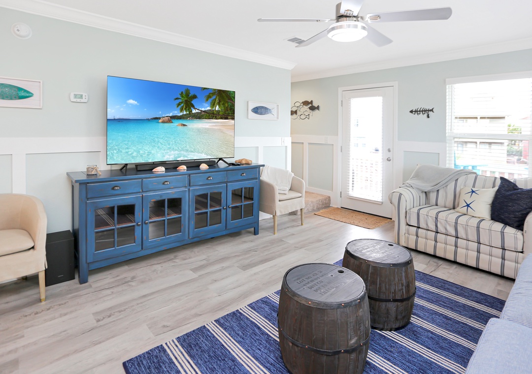 There is ground floor entrance into the property where you’ll find a large king bedroom, full bath and laundry area. Making your stay more comfortable, there is a separate A/C unit and mini fridge included in this bedroom. Upstairs on the main floor is the living level with an open design with the living room, dining area, kitchen and half bath. Take a step outside of the living room onto the canal front deck to enjoy the fresh air. On the top floor are the other two bedrooms; one suited for the kids with a twin and double bed, and the 2nd is more of the master with a king bed and another canal front deck. There is a full bath shared between these two bedrooms. Each bedroom has its on TV.