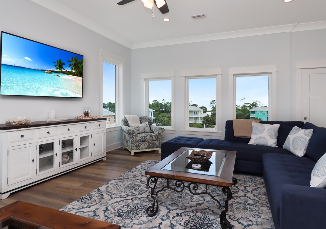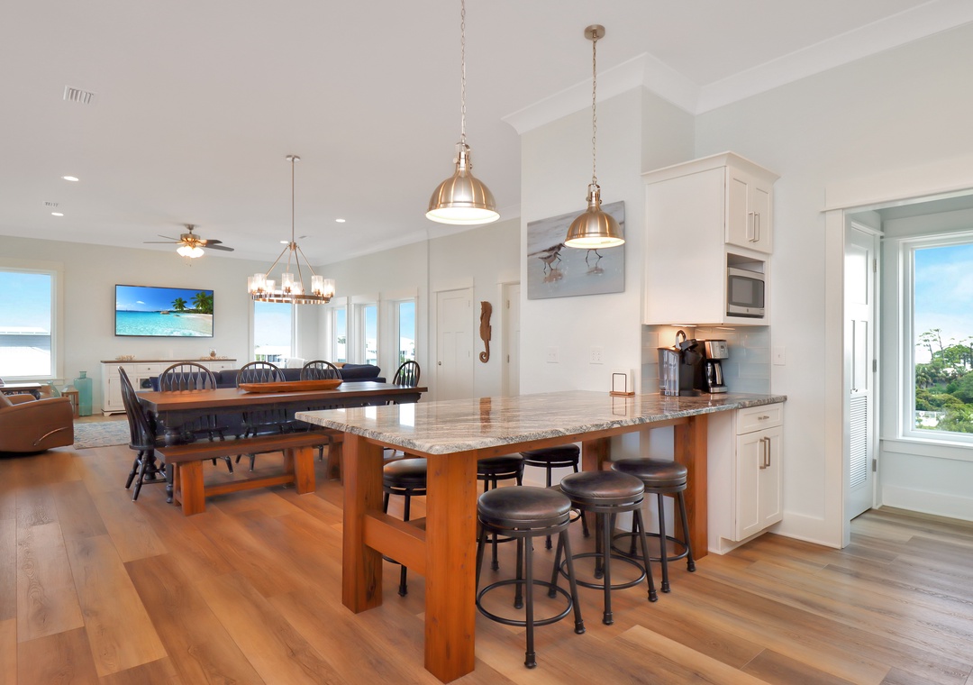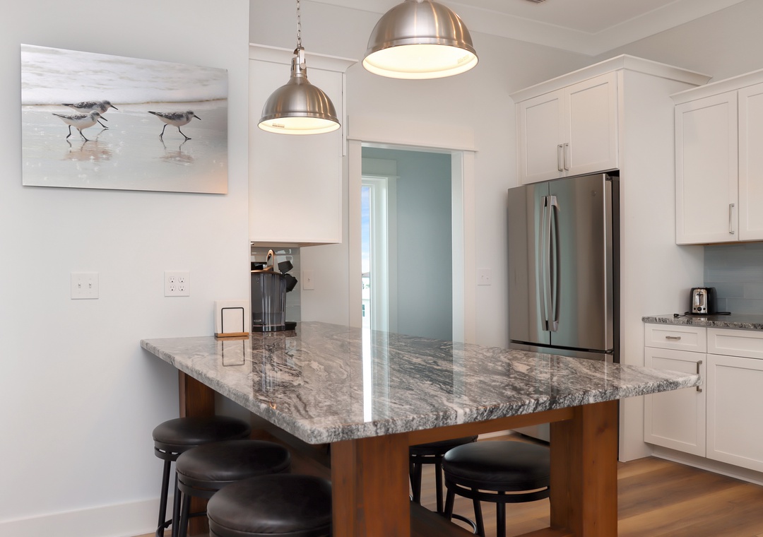 On the top floor of this stunning vacation rental home, you'll be greeted by a spacious living area with ample seating and a large flat-screen TV. The modern and stylish decor sets the tone for a luxurious stay. The fully equipped kitchen with high-end appliances and granite counter tops is perfect for cooking up delicious meals while enjoying the breathtaking views of the Gulf of Mexico.