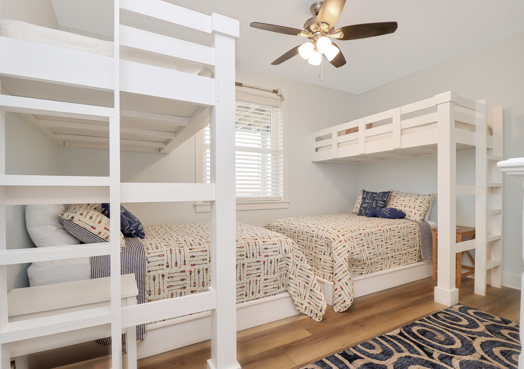 Bedroom with two sets of custom bunkbeds with double bottom and twin top beds.