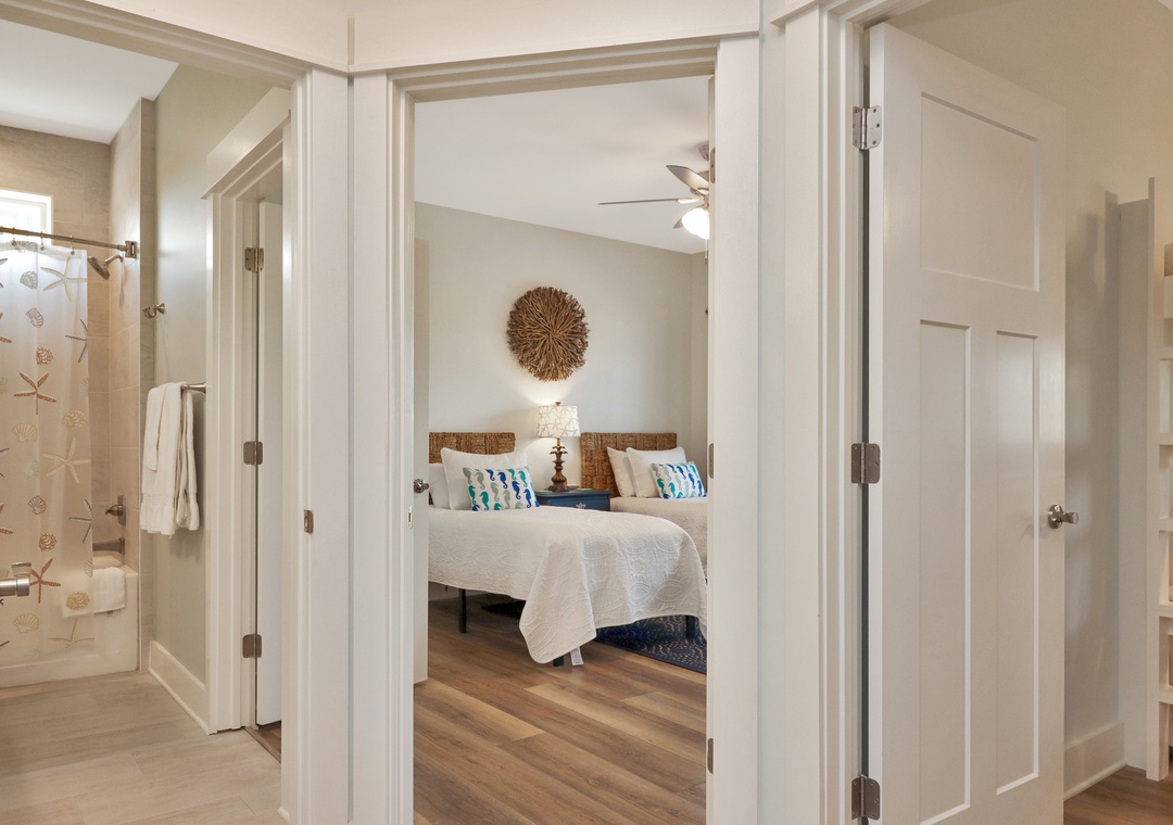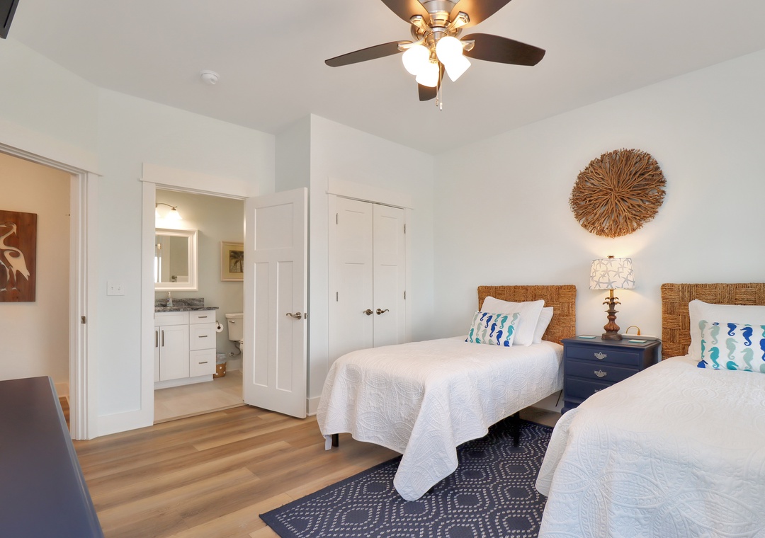Guest room with two twin beds and full bath attached.