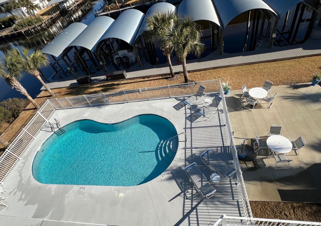 * Covered Deck with Canal and Pool Views from Adirondaks