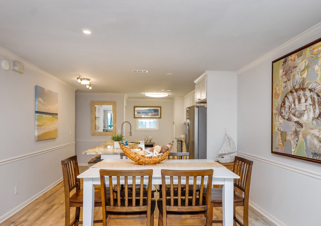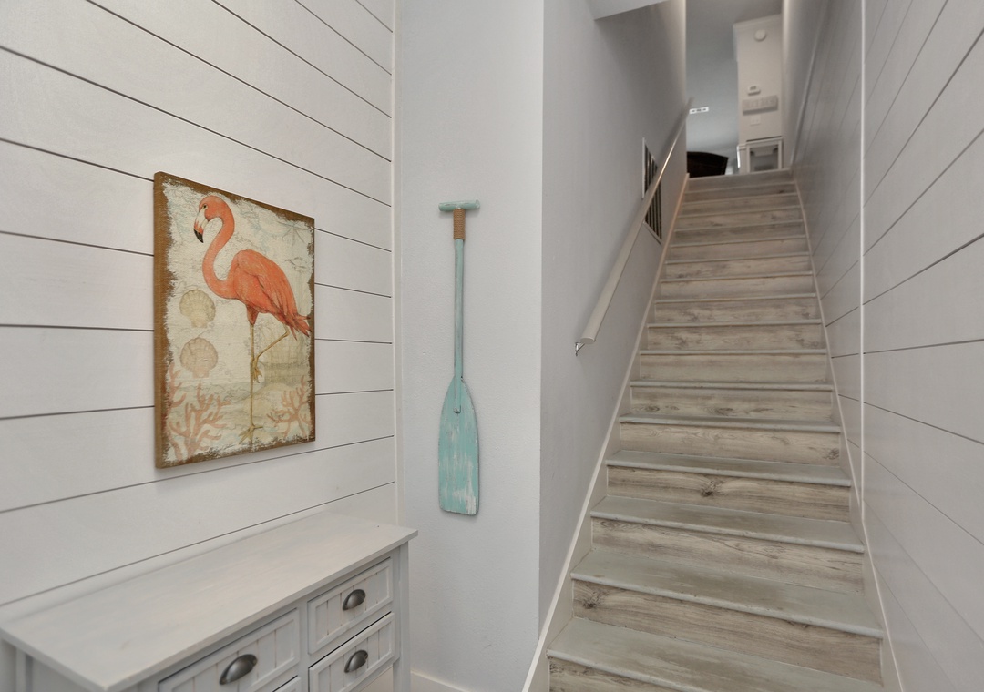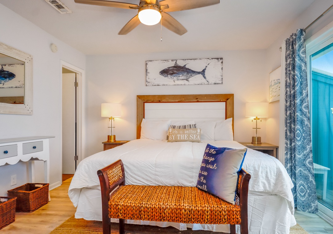 We traveled with a group of friends and our dog and the setup of the condo was perfect. Main floor is the living area with a big open kitchen and living room with tons of seating and a tv. There's also a large screened in porch on this level which is great for enjoying some bug free/low wind outdoor meals. The top floor is the sleeping area with 3 bedrooms. The main bedroom has a queen bed with an attached bath and open air balcony. The other two bedrooms each have two beds, one with two full beds and a small bay-facing balcony and the other with bunk beds and no windows. (The bunkbed room is very dark with the door shut so if you have kids you might want to bring a nightlight).