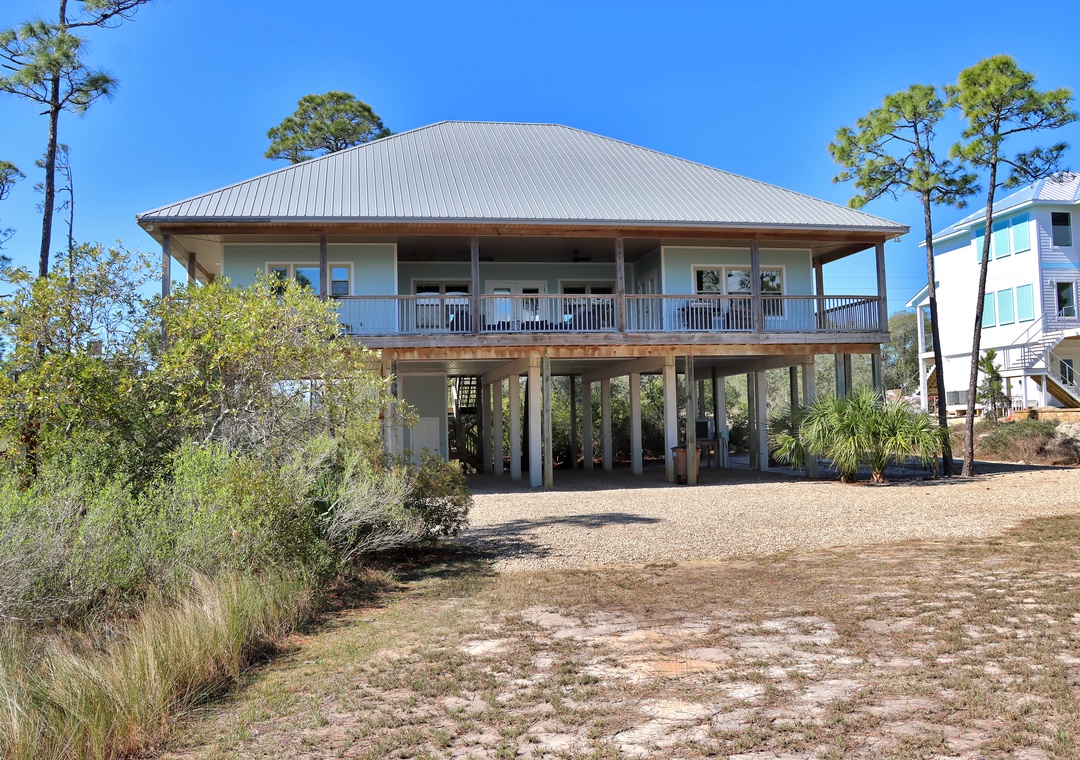 Welcome to Treetops, your serene bayfront retreat in Cape San Blas. This charming single-story home, elevated on pilings, features a spacious open floor plan with 2 bedrooms and 2 baths, accommodating up to 4 guests. Enjoy breathtaking bay views from the expansive covered deck, complete with outdoor furniture, and take advantage of the private dock for all your coastal adventures. Just a short 0.1 mile walk brings you to Cape Tradin' Post for pizza, ice cream, and other essentials. Experience the perfect blend of relaxation and convenience at Treetops.