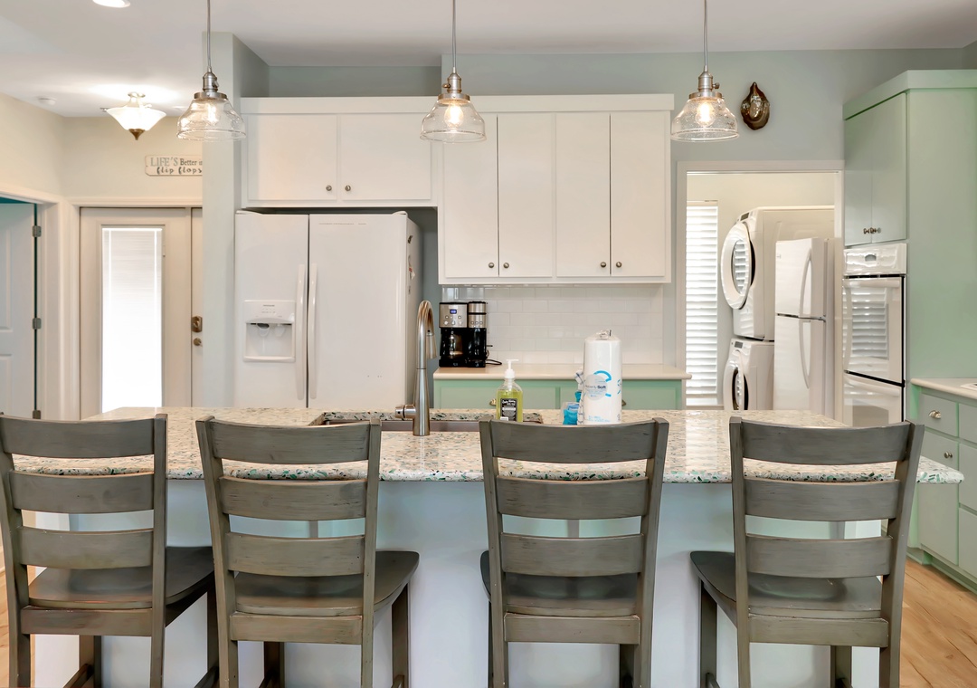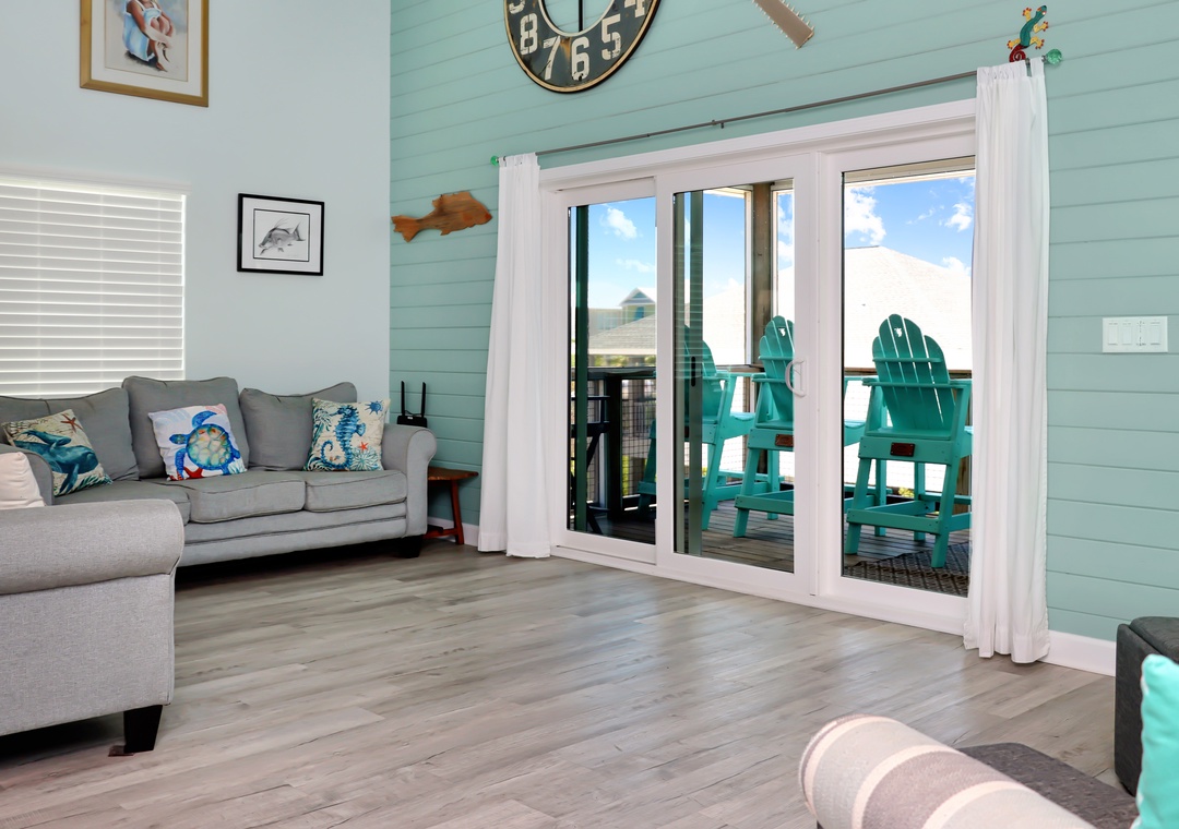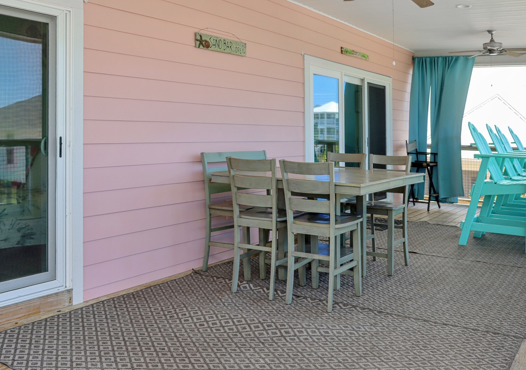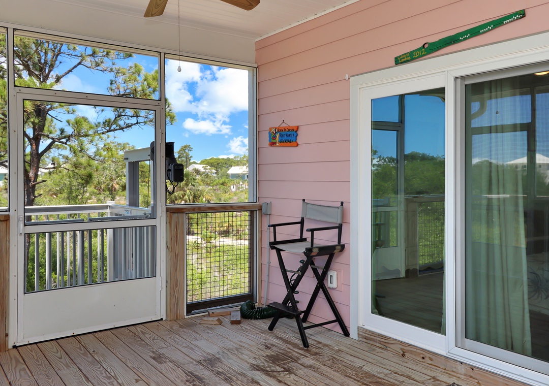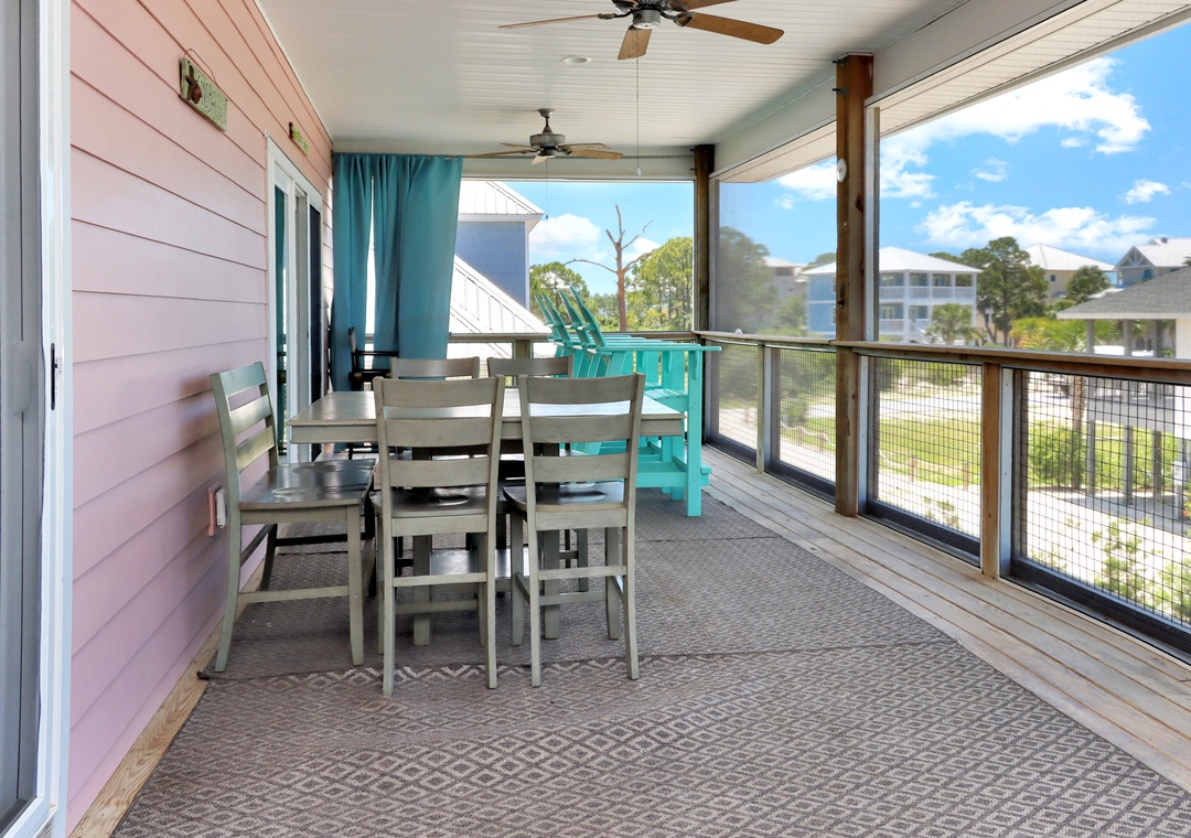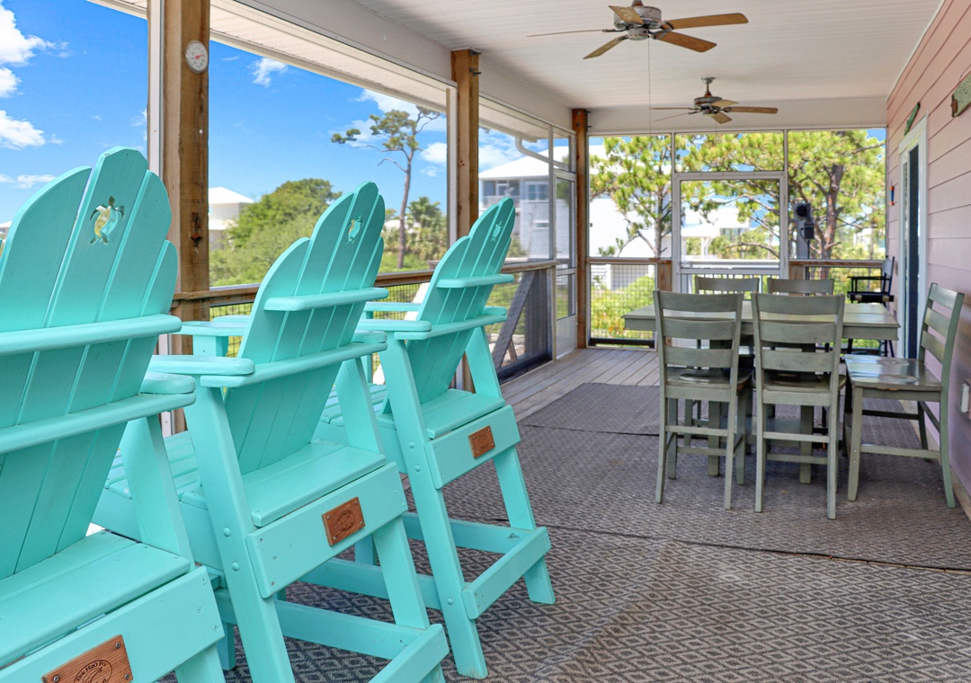 Step inside to discover a spacious screened deck on the main level, complete with an outdoor dining table and high-back Adirondack chairs from which to savor the breathtaking beach views. The main living area is designed for your comfort and relaxation, with a well-appointed kitchen, a comfortable dining area, and a cozy living room that opens onto the screened deck through sliding glass doors.