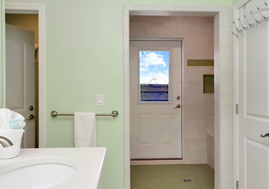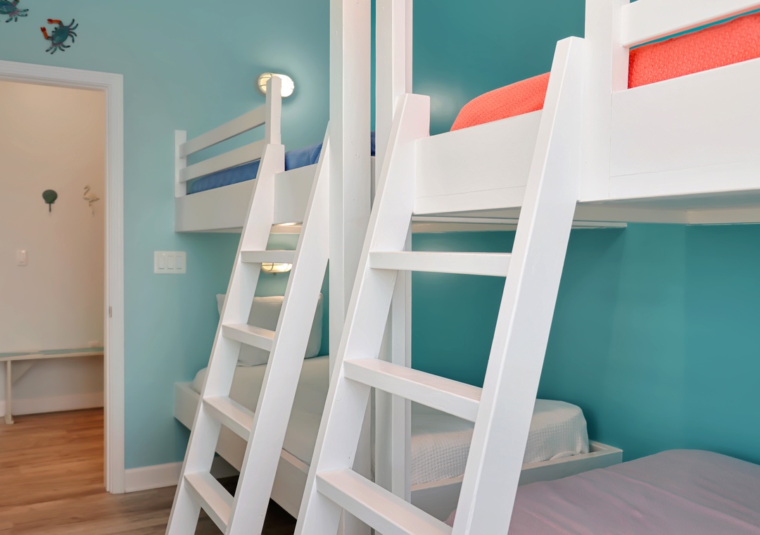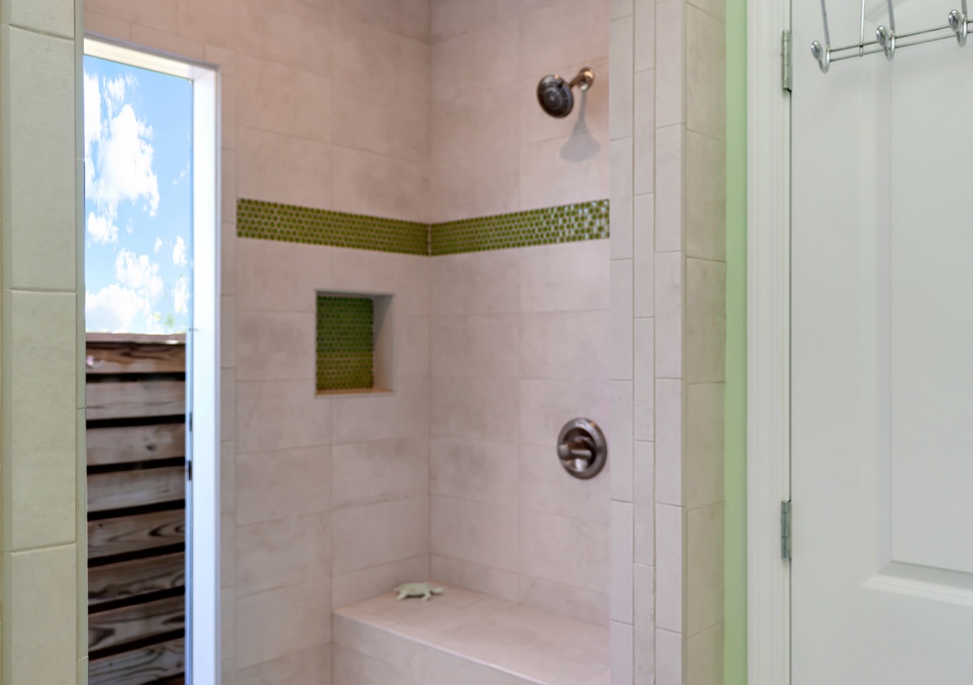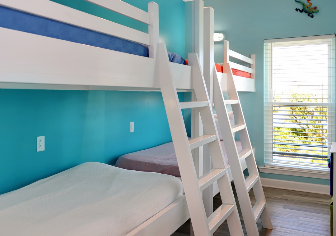 The main level also features a bedroom with dual bunk beds and a second master suite. One of the standout features of this master bedroom is the magnificent walk-in shower. This unique amenity is not just a place to cleanse, but an experience in itself. The expansive shower area is completely open, free from doors or curtains, offering an airy, spa-like ambiance. The shower seamlessly transitions to an exterior door, which leads you to a small, enclosed deck. Here, you will discover an enchanting outdoor shower, surrounded by privacy walls that provide an intimate connection with nature while maintaining complete discretion.