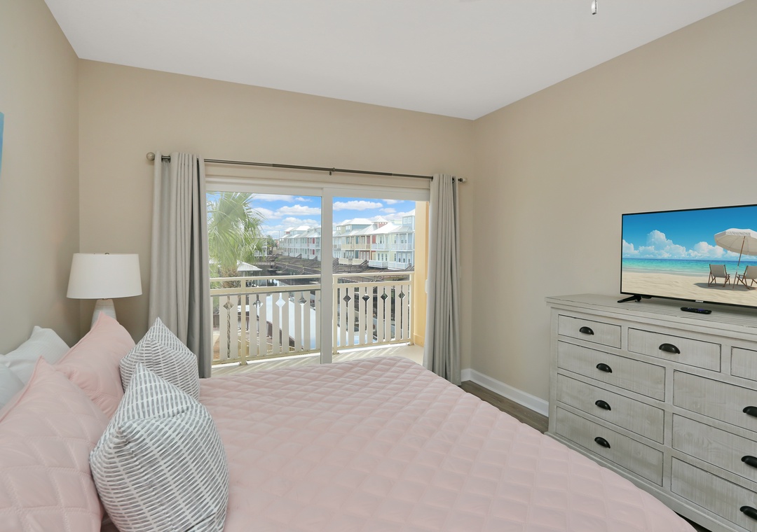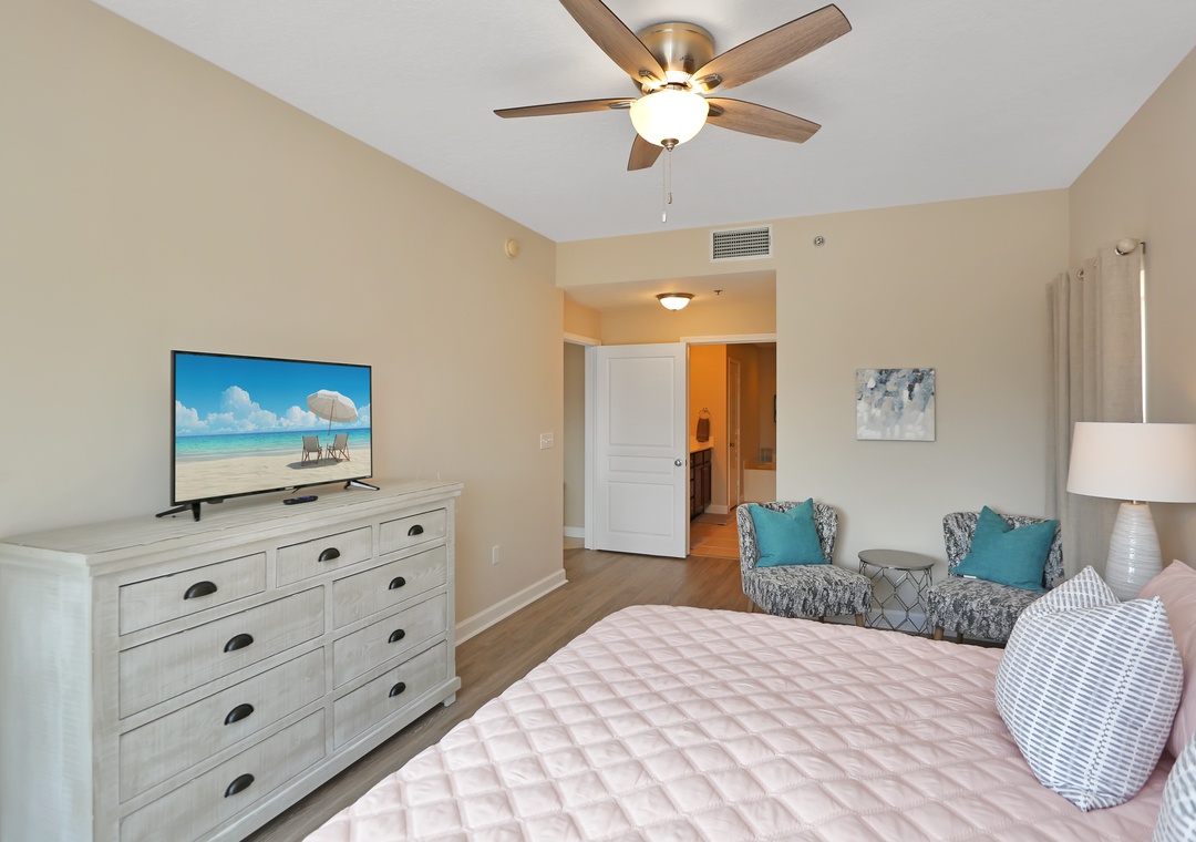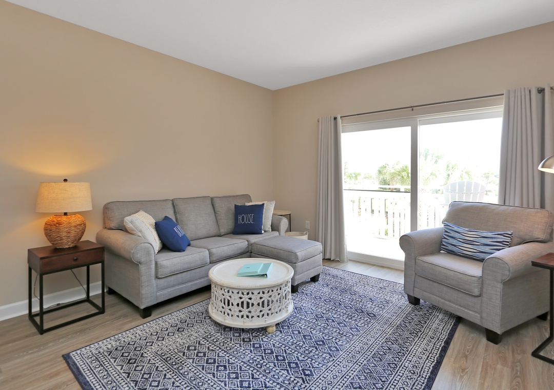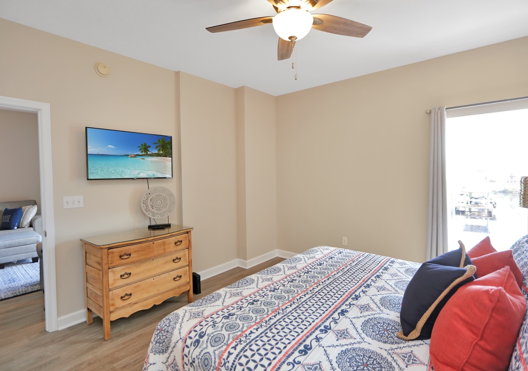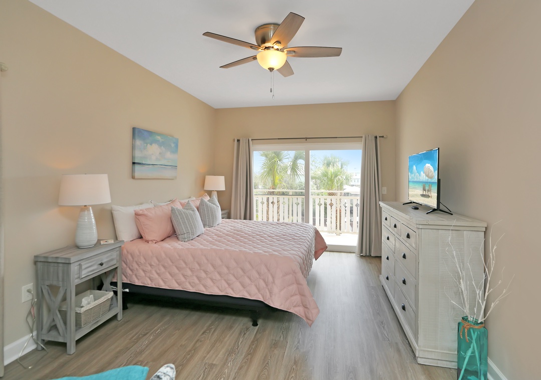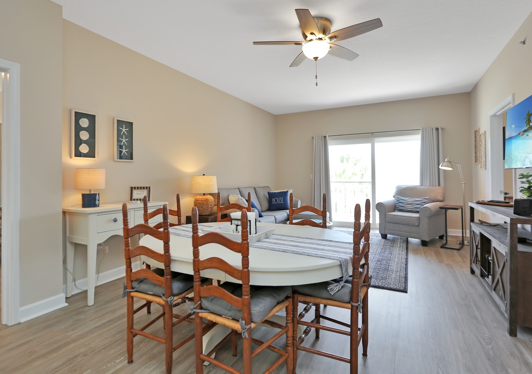Condo 203 is on the second floor, accessed by either stairs or an elevator. Once inside, the living space is laid out all on one level. The owners have done a fantastic job decorating and equipping the three-bedroom rental making it the perfect spot for your party of 8. The two masters, both with king beds, are convenient for multiple couples and a twin bedroom for the kids.