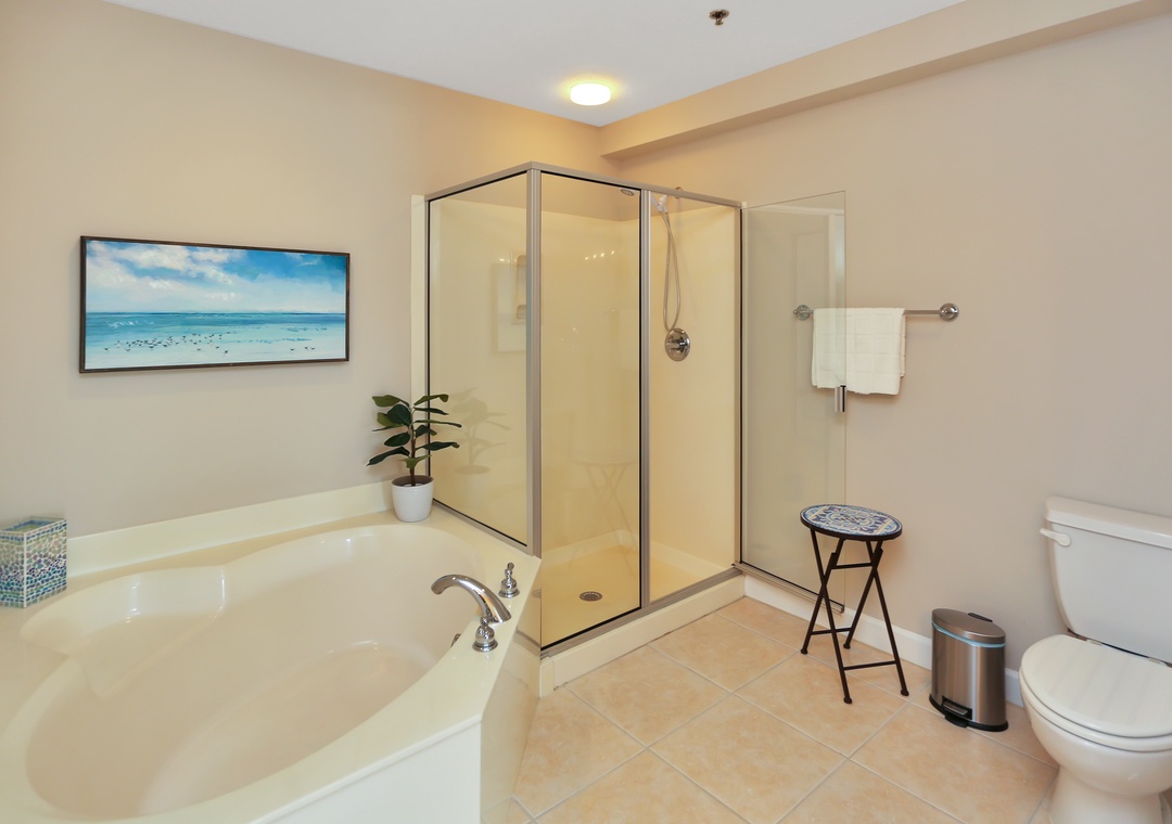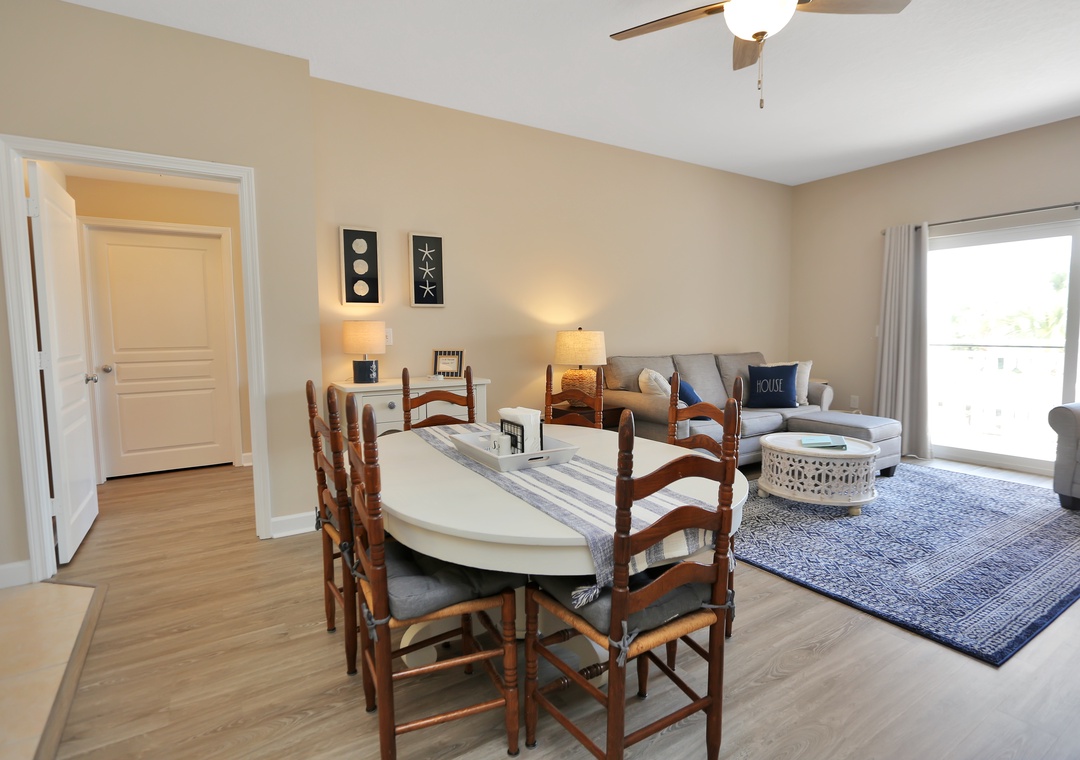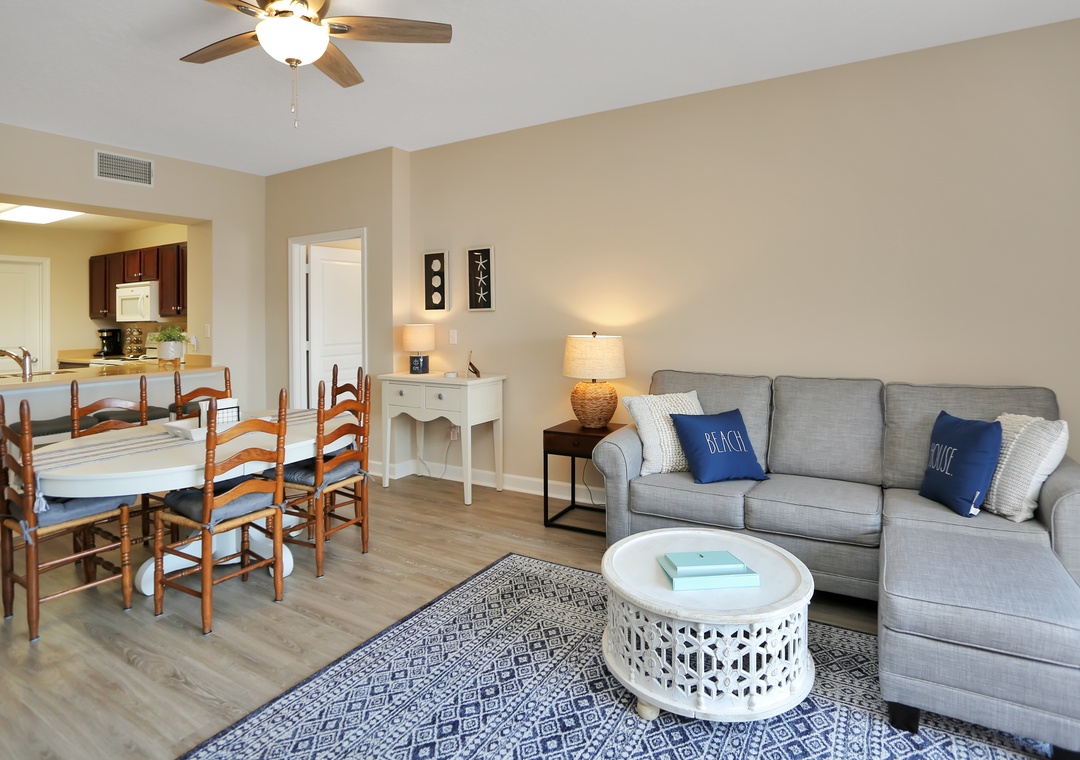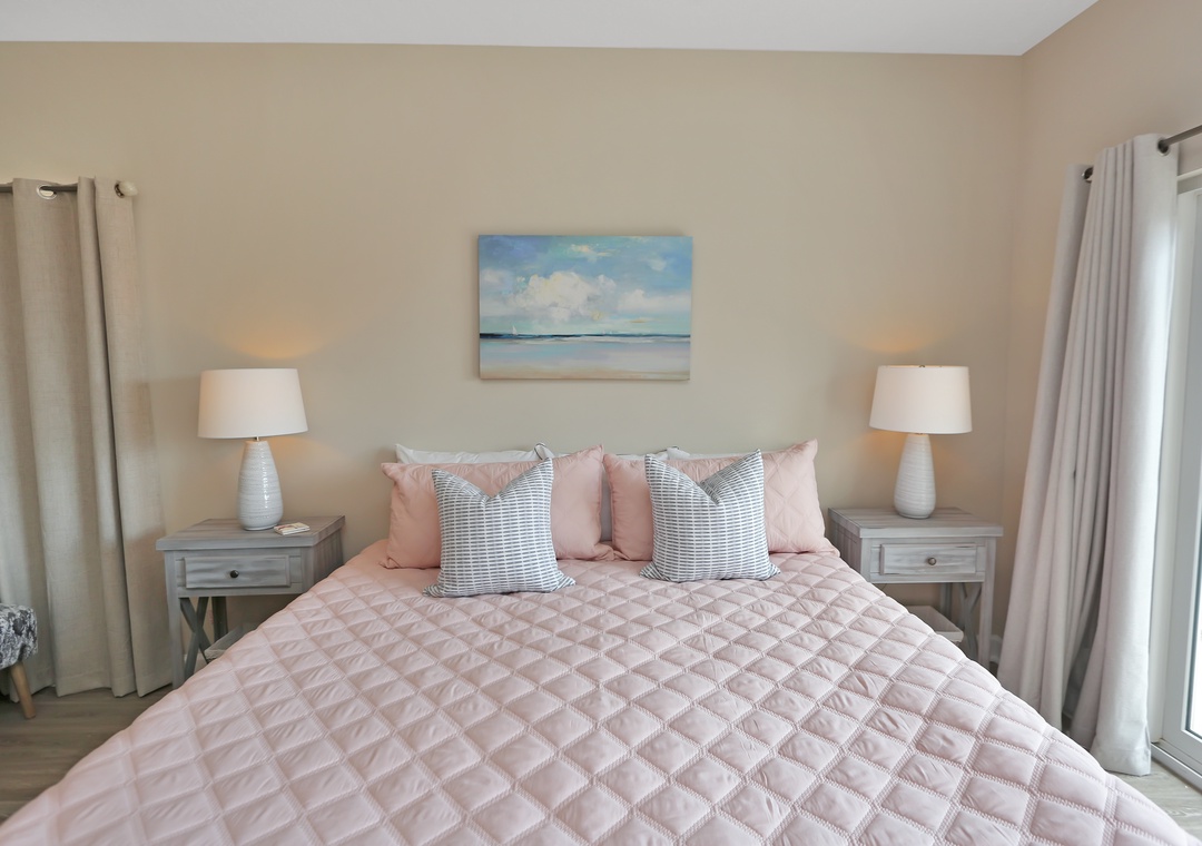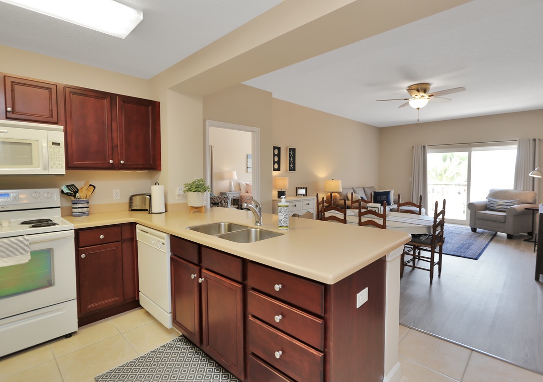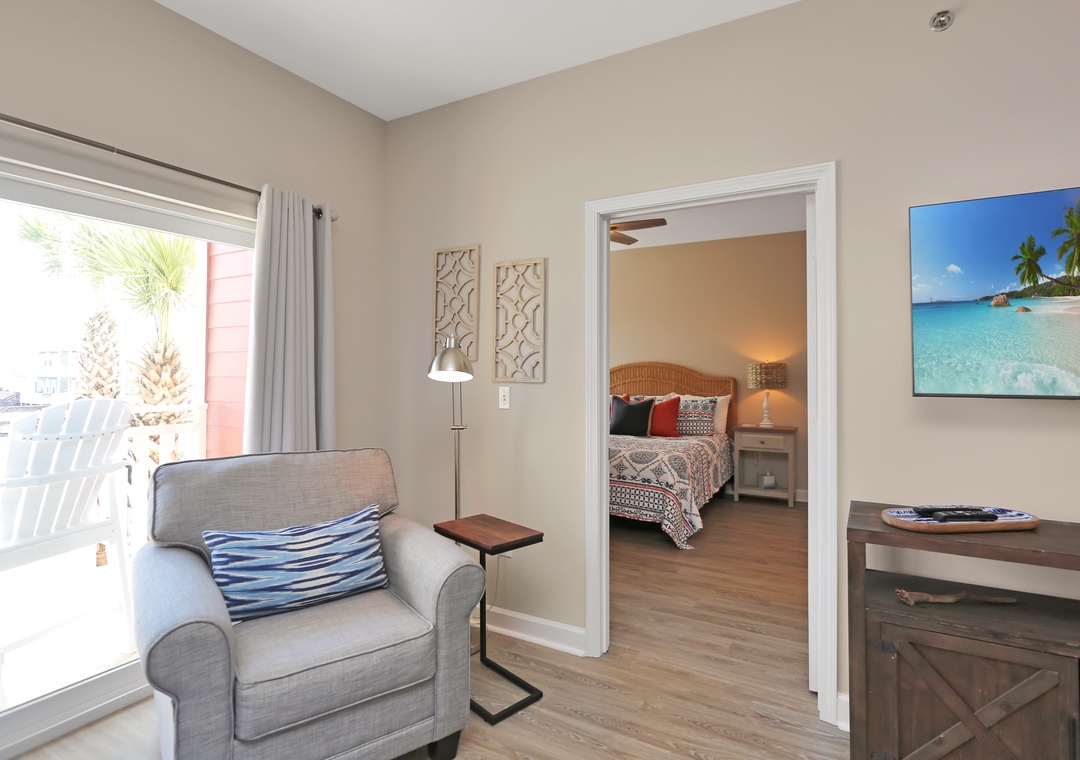 Condo 203 is on the second floor, accessed by either stairs or an elevator. Once inside, the living space is laid out all on one level. The owners have done a fantastic job decorating and equipping the three-bedroom rental making it the perfect spot for your party of 8. The two masters, both with king beds, are convenient for multiple couples and a twin bedroom for the kids.