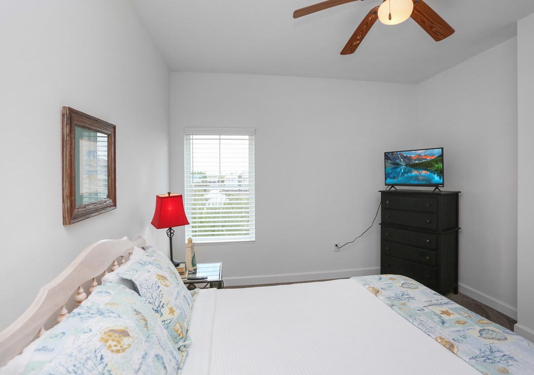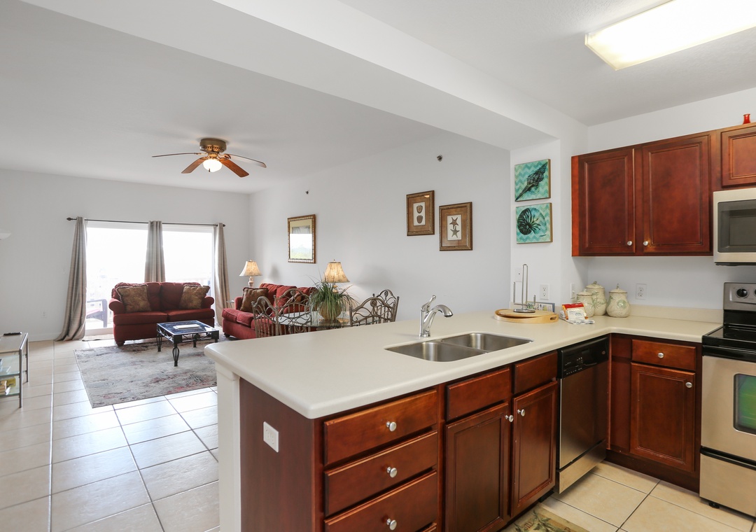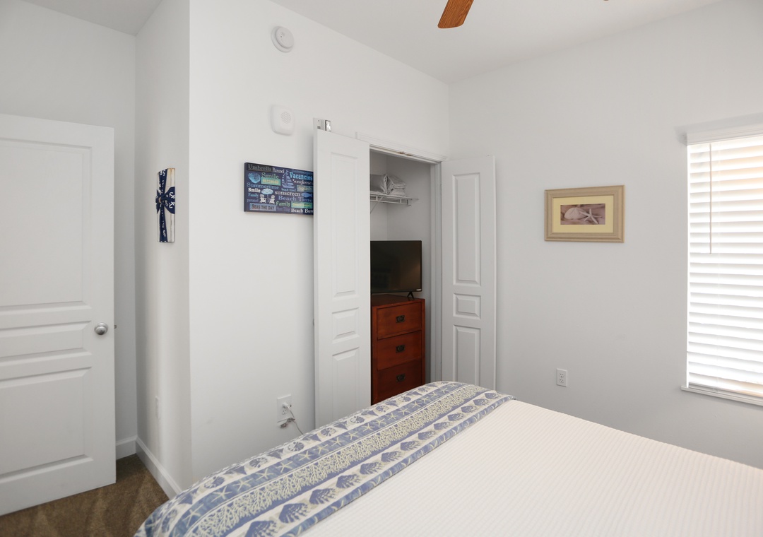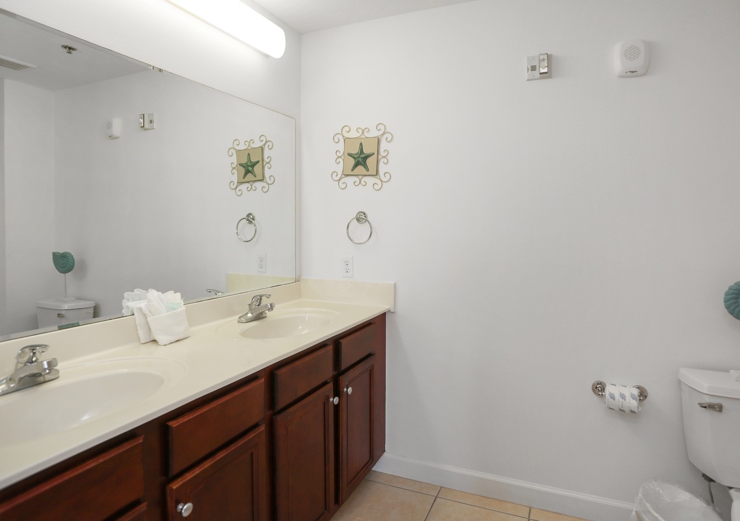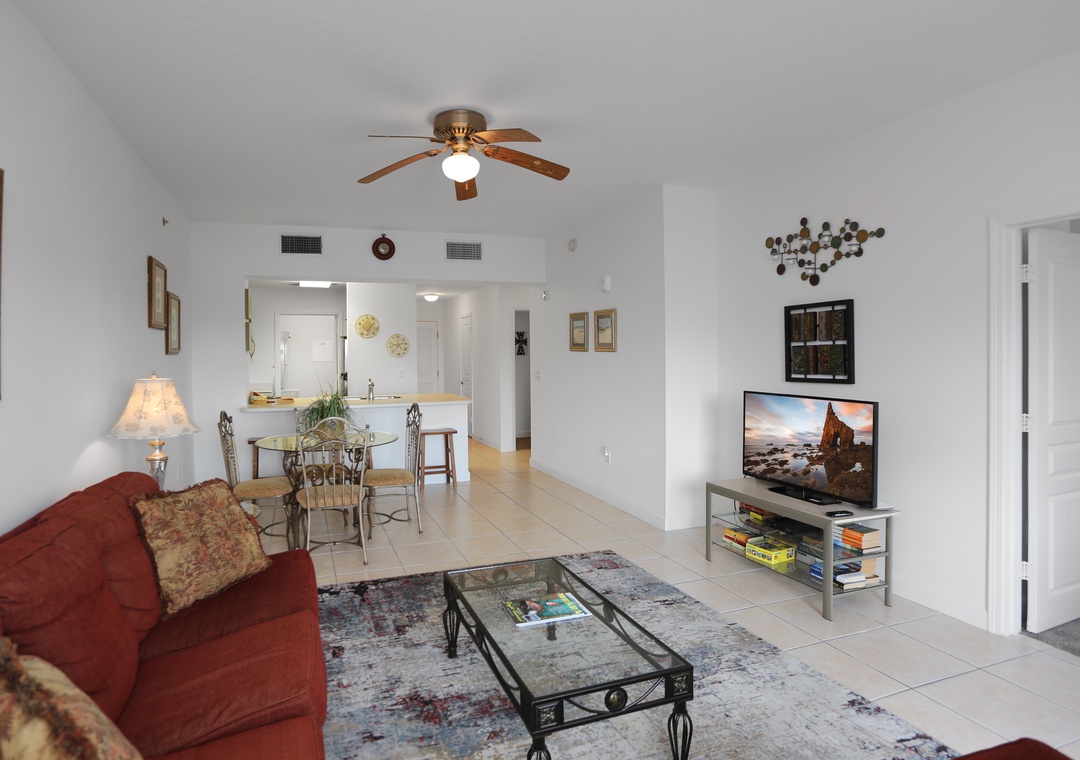 Floor Plan: Well-stocked kitchen with laundry room, dining area, living room with sleeper sofa, TV, DVD, and furnished balcony; Bedroom 1 - the master with a queen bed, walk-in closet, TV and full bath with double vanity; Bedroom 2 with a double bed and TV.