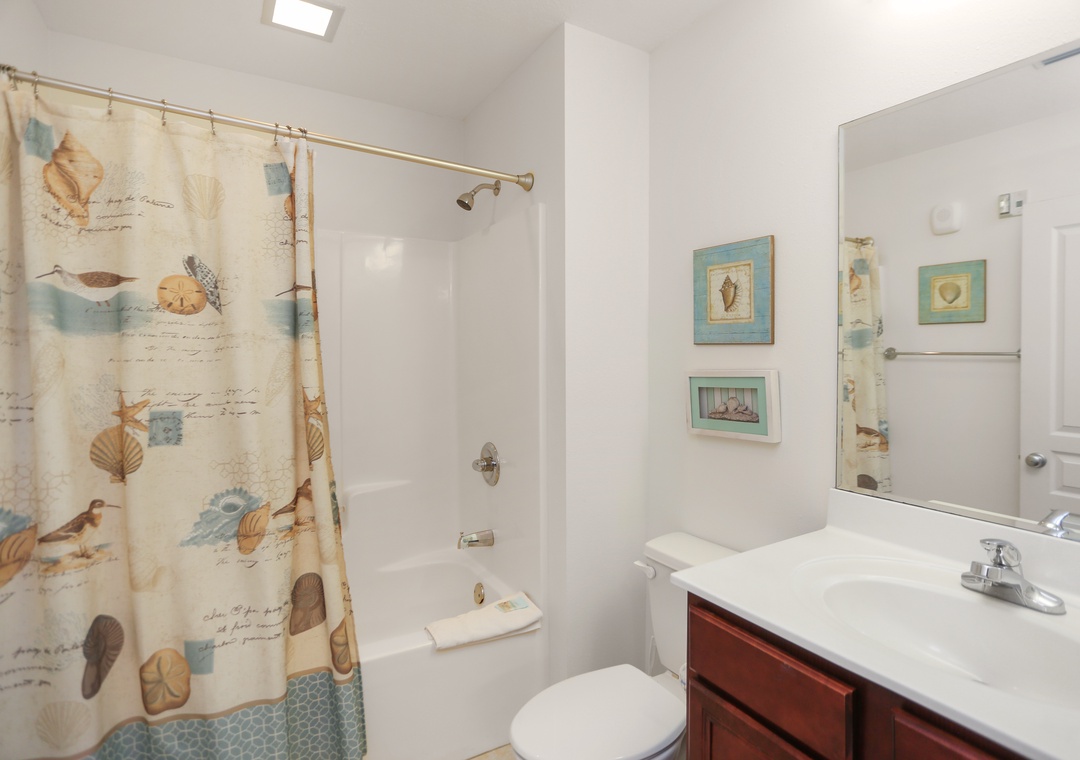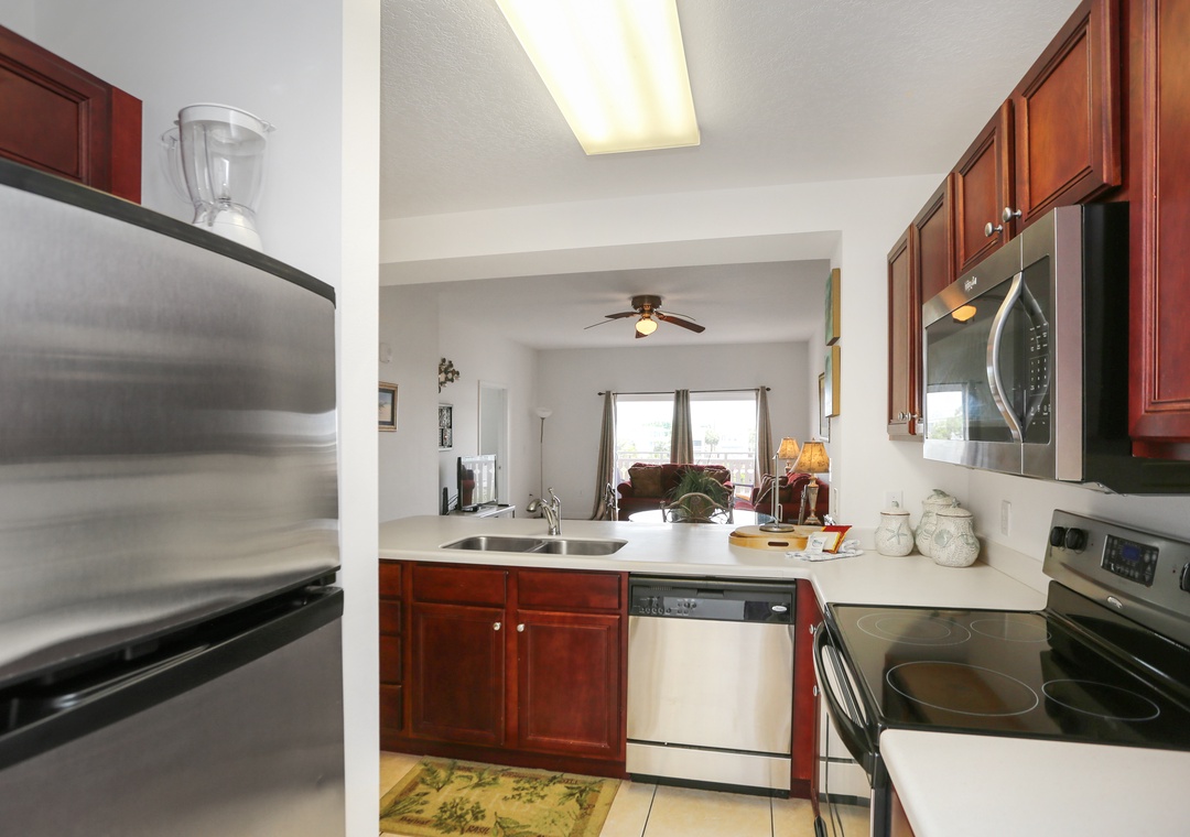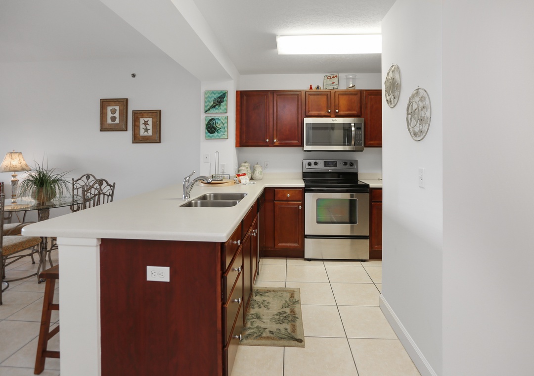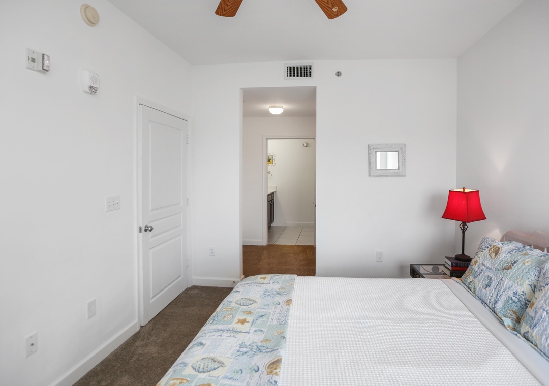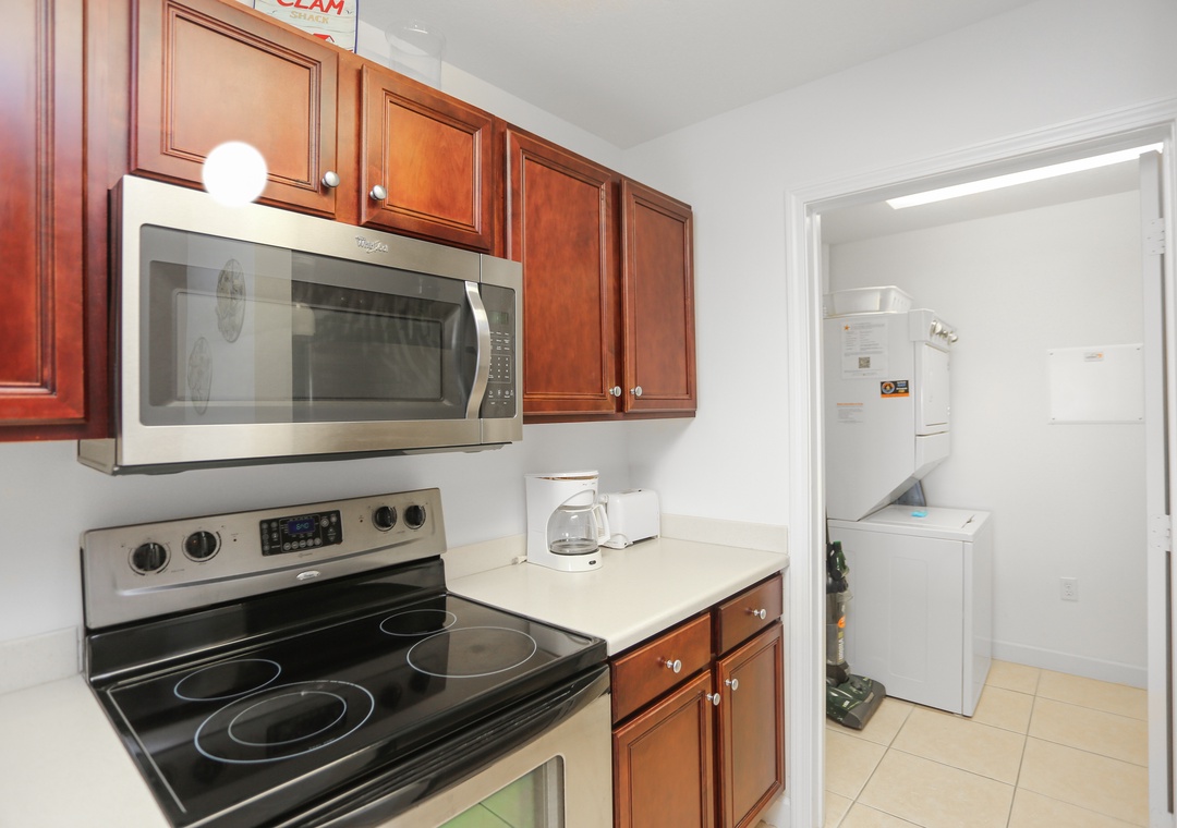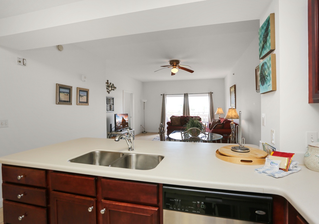 Floor Plan: Well-stocked kitchen with laundry room, dining area, living room with sleeper sofa, TV, DVD, and furnished balcony; Bedroom 1 - the master with a queen bed, walk-in closet, TV and full bath with double vanity; Bedroom 2 with a double bed and TV.
