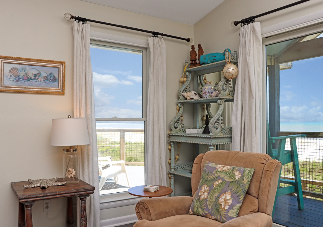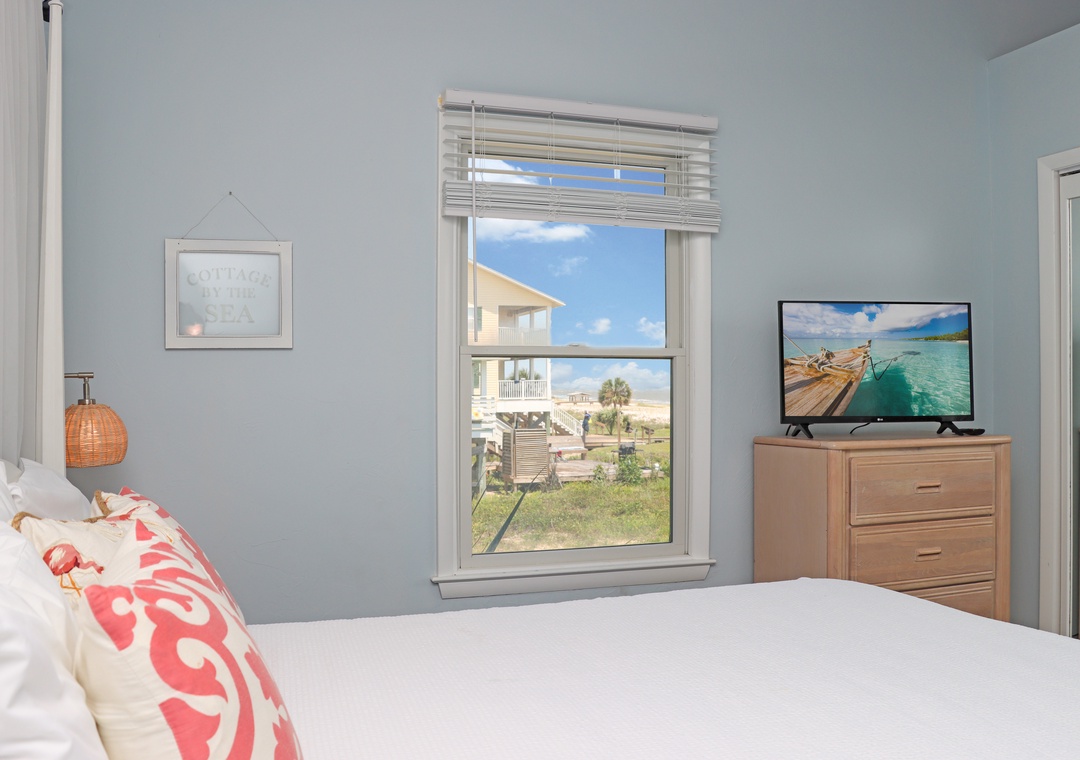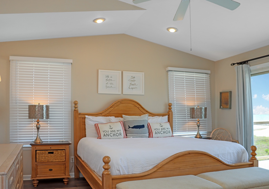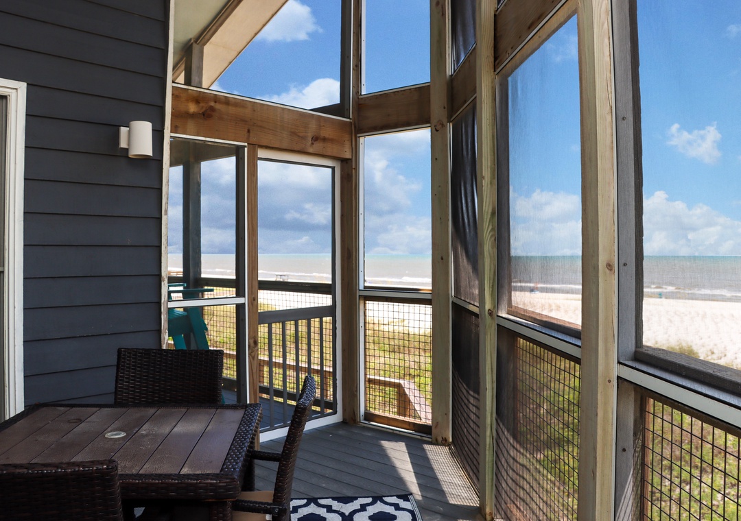 Click Here To Learn More!Floor Plan: Ground level-Covered, paved parking. 1st level-right as you enter you’ll find an office area with work desk, custom shelving with books, puzzles and games; laundry room, open kitchen area, dining area which opens onto the screened porch; gulf front living room with large flat screen TV, DVD and opens onto the deck. Bedroom 1 – gulf front master bedroom with king bed, walk-in closet, entrance to open deck and large master bath with an oversized whirlpool tub and separate shower; Bedroom 2-king bed; full bath and Bedroom 3 - 2 double beds.