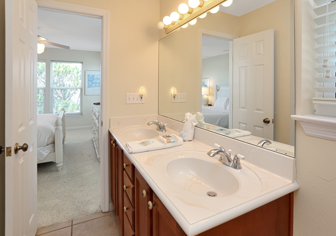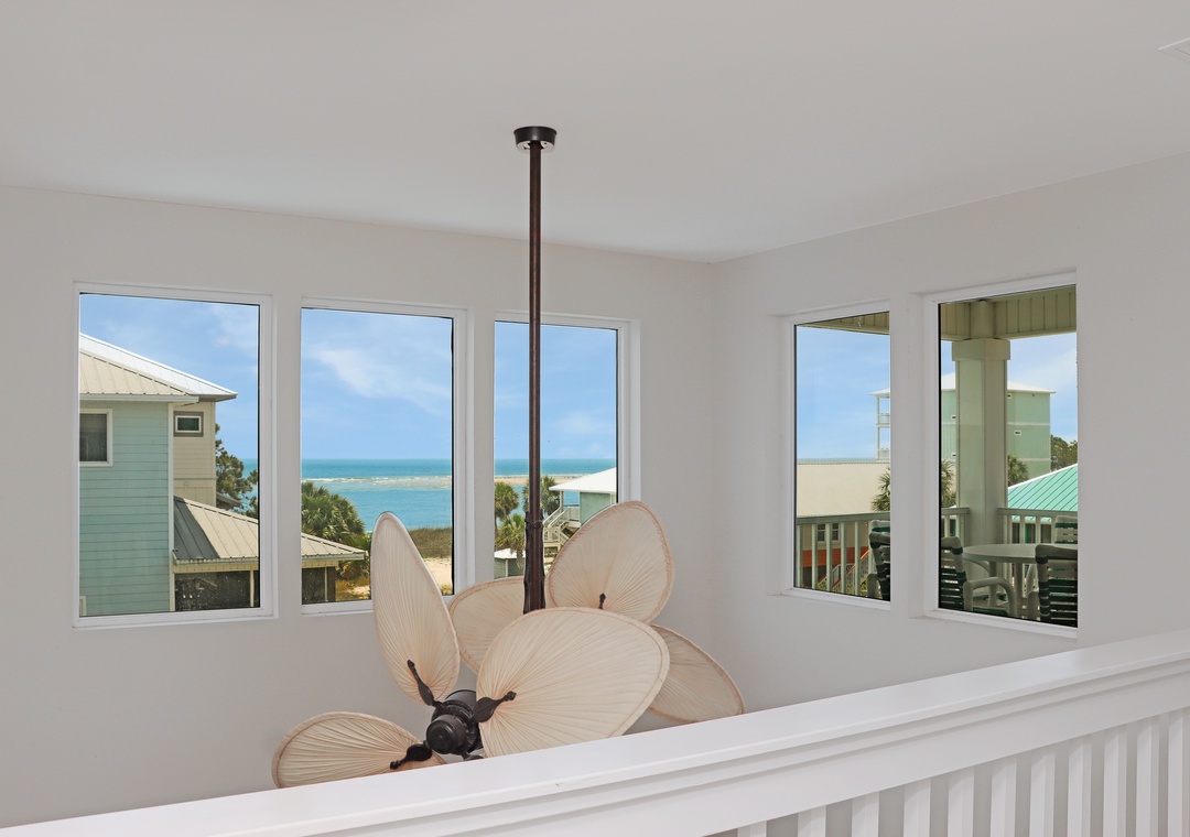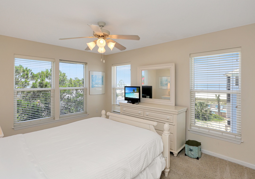 2nd level – laundry closet, Bedroom 2 –1 duo bunk along with another bunk set, TV/DVD (no cable); loft area with a gulf view and entrance onto a covered deck; Bedroom 3 – gulf view bedroom with a queen bed, TV, telescope and full bath with double vanities and shower/tub combo; Bedroom 4 – king bed, gulf view and TV; and full bath with double vanities and shower only.